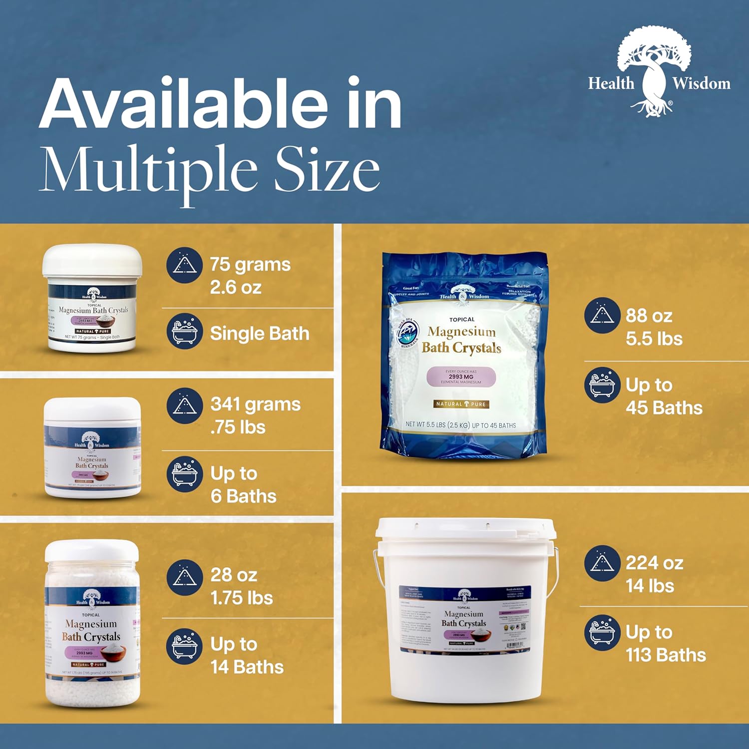 Health and Wisdom Magnesium Bath Crystals - Bath Salts with High Concentration & Enhanced Absorption for Muscle & Joint Relief - Dead Sea Sourced - Unscented - 2.6 oz - Single Use