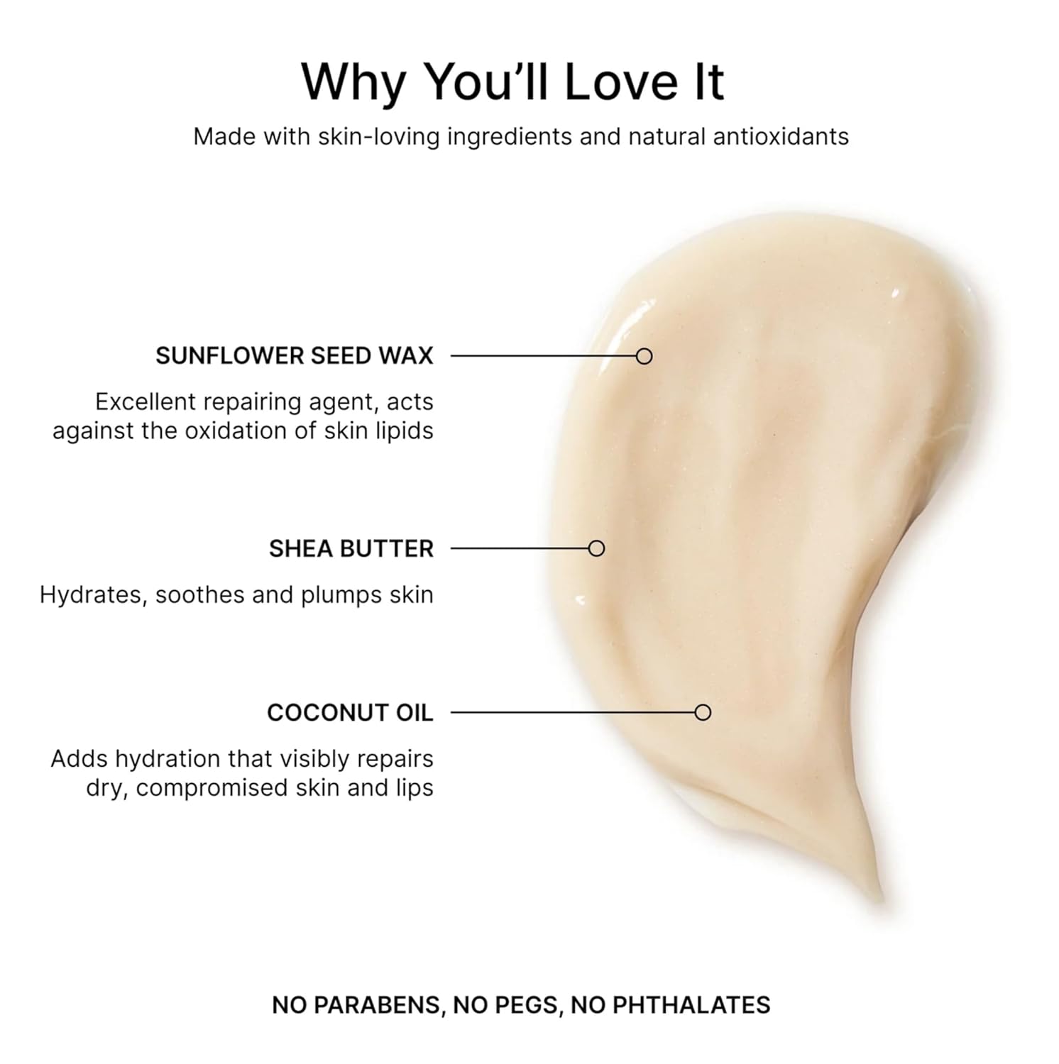 - SKIN LOVING. Loaded with skin loving ingredients such as organic sunflower seed oil, organic coconut oil, nourishing shea butter, and natural antioxidants. Made without parabens, sulfates, phthalates, petrochemicals, and GMOs. Clean Beauty.