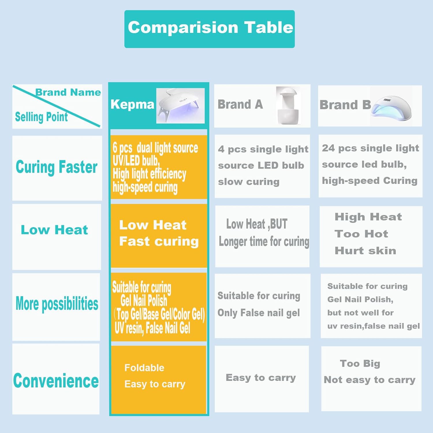 - 1.【Attention Please: The lamp works well with GEL nails but not for TRADITIONAL nail polish】 Dual light sources (wavelength 365nm+405nm), makes it works fastly with gel nail polish(top coat/base coat/color gel),gel stickers and uv resin,but not for traditional nail polish. The traditional nail polish needs to be air dried rather than curing by uv nail lamp.