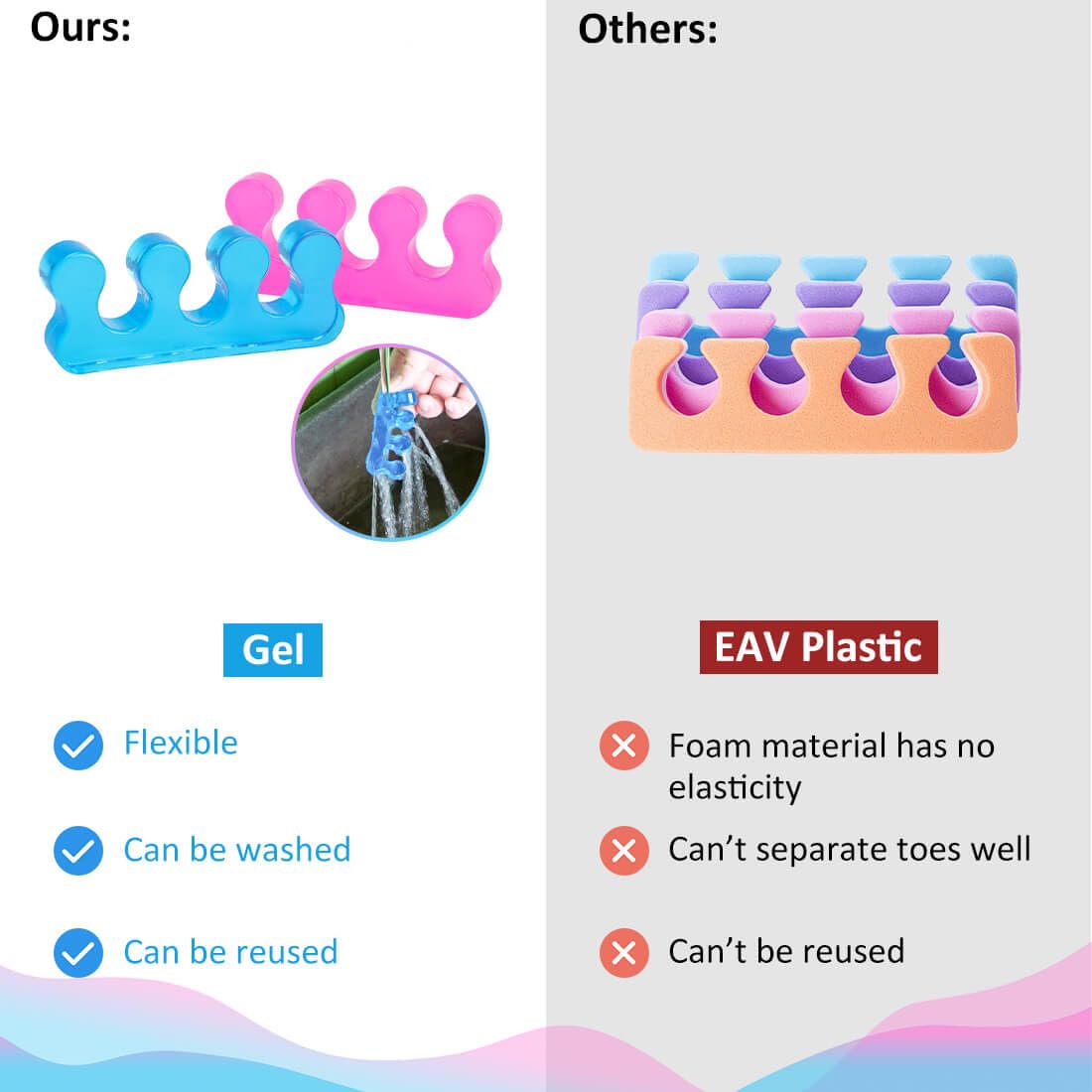 - 🛀【Gel material】: Flexible gel toe dividers pedicure,Toe separators pedicure can be stretched,soft and durable,one size fits most fingers and toes.【Warranty】:We love our customers,If you are troubled by product problems,please contact us as soon as possible to solve it for you,including return or exchange.