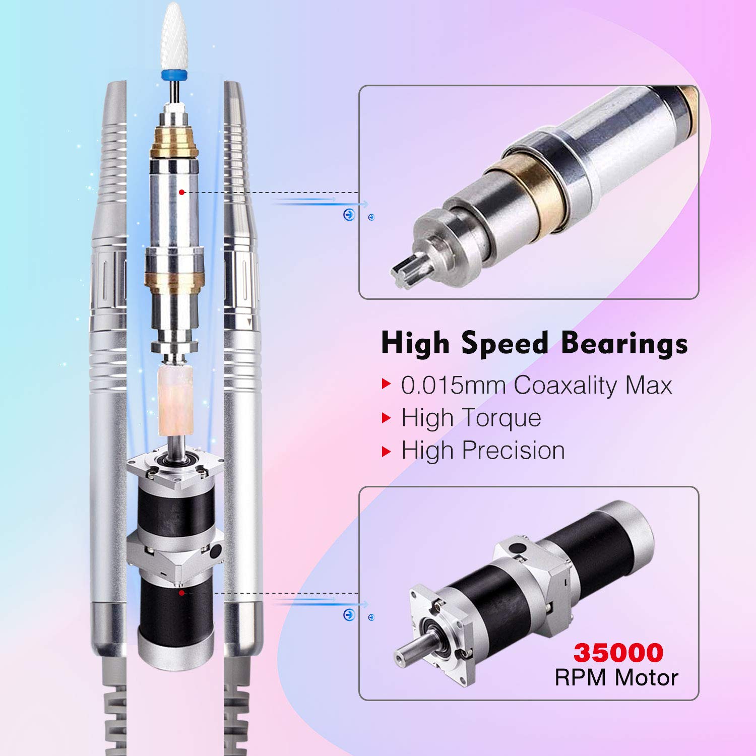 - 【Powerful 80W Brushless Motor】The handpiece is equipped with brushless motor, which is totally driven by magnetic force. Wear-free motor for long-term use, more than 1000h service time. It is quiet and smooth for comfort grip. Low noise for smooth and long-time operation. The professional nail drill with a unique safety protection system to avoid the motor excessive temperature rise.
