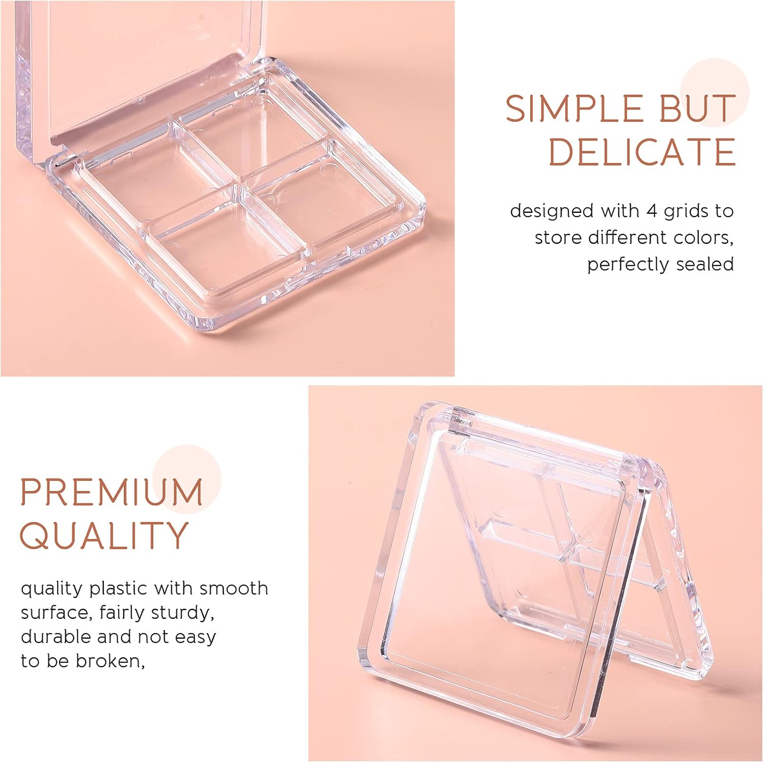 - Refillable Eyeshadow Storage Case - Designed with 4 grids to store different colors, simple but delicate, perfectly sealed to prevent unnecessary leakage. Made from durable and transparent material, these empty boxes are not only sturdy but also allow for easy visibility of colors. The clear design ensures that you can easily identify the shades of your eyeshadows without having to open the box