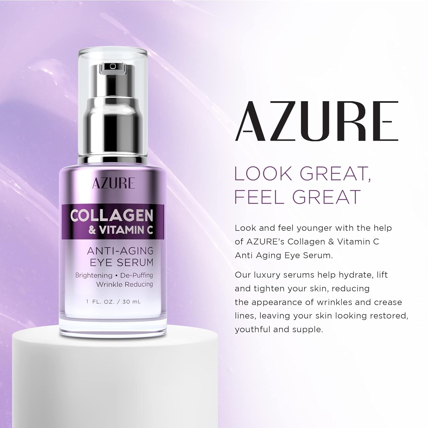 - NEVER LOOK TIRED AGAIN: The AZURE facial oils and serums are specially formulated to help hydrate, tighten and brighten tired, dull and dehydrated skin, minimizing signs of aging and fatigue, including wrinkles, puffiness, dark circles, and crow's feet. Our collagen peptides and vitamin c eye serum will help you achieve a more youthful and glowing appearance.