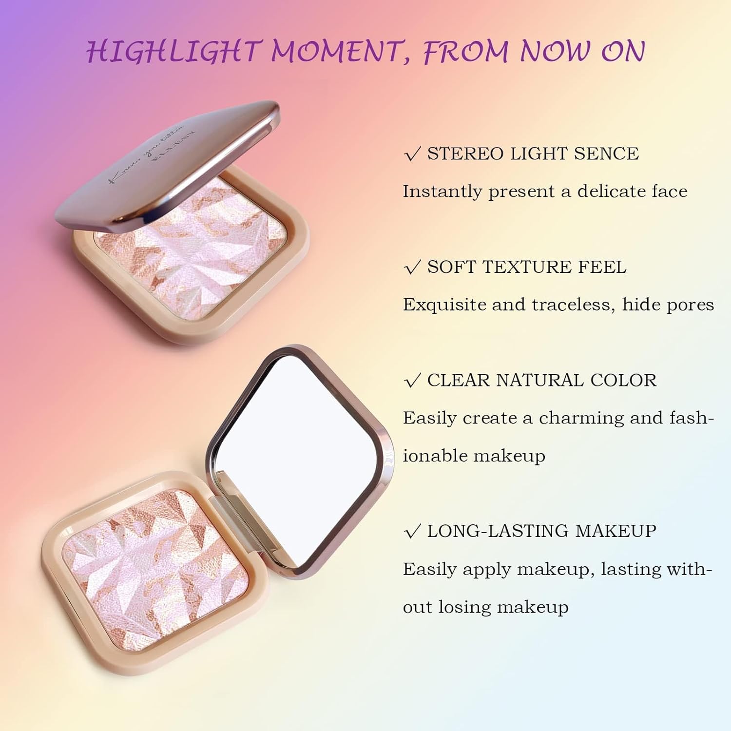 - 【SOFT & LONG LASTING】- This highlighter powder has a super silky soft texture, the light naturally hits your face and achieve that seamless coverage, and structured without overly dramatic or thick. Has a good color rendering, can instantly brighten the skin, cover the defects.