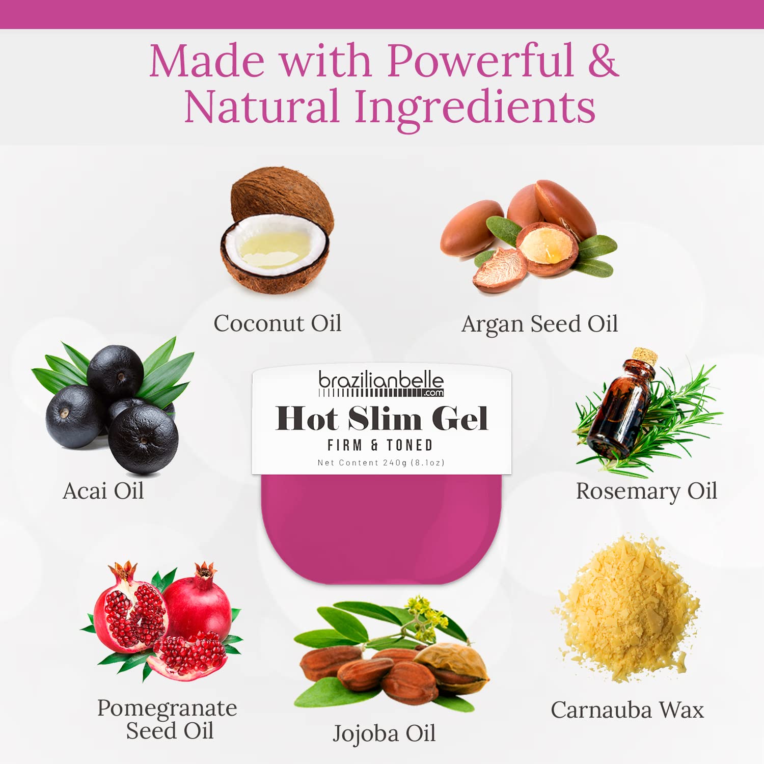 - Main Ingredients: 1. Coconut Oil: Helps minimizing cellulite appearance. 2. Acai Oil: Highly emollient and moisturizing oil. 3. Argan Oil: Nourishes and helps combating cellulite. 4. Jojoba oil: Promotes collagen production and helps reinforce skin's protective barrier layer.