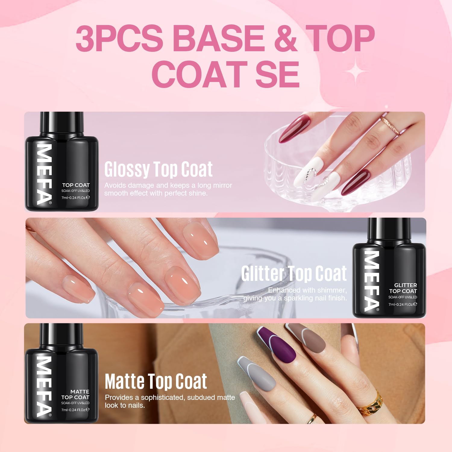 - Nice Box: MEFA 20 X 7ml Spring Summer Neon Colors Gel+ 7ml Base Coat, No Wipe Shiny Gel Top Coat & Matte Top Coat, no need to purchase the base and top coat separately. This summer gel nail polish colors set has a wide range of colors at your fingertips