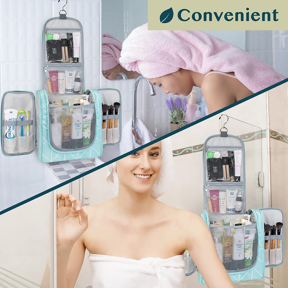 - COSMETICS TRAVEL BAG ORGANIZER: This toiletry bag for women has a hanging hook and multiple pockets that help you stay organizer during business trip, vacation travel. The hanging hook makes it easy to hang the toiletry bag to bars in the hotel shower bathroom. Unzip your toiletry bag to reveal compartments to organize your shampoo, skincare face hygiene products. This toiletry travel bag is an essential accessory for cruise in Europe, plane, Hawaii Trip, and honeymoon.