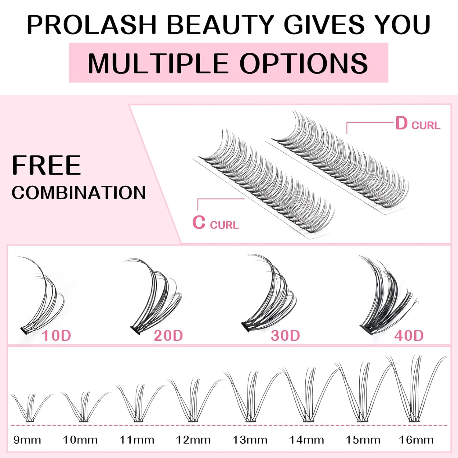 - Unique: The now very popular individual lashes are now available in PRO LashBeauty, and it is especially worth highlighting that PRO LashBeauty can provide 280 lashes in one tray! The blended lengths range from 9mm to 16mm, curls include C and D, and there are also have 10D, 20D, 30D, 40D, 10D+20D, 30D+40D. With a variety of styles for you to choose from. For the same price, you get more lashes and more uses.