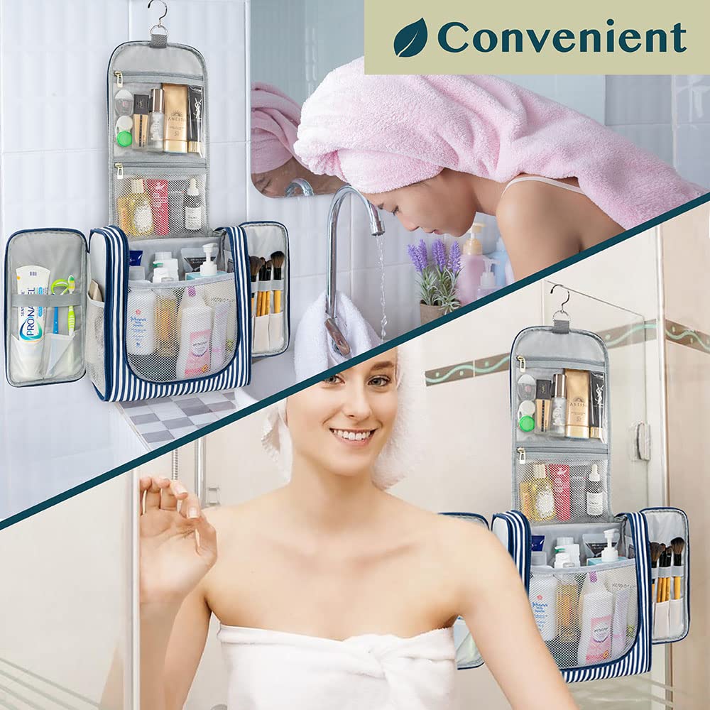 - COSMETICS TRAVEL BAG ORGANIZER: This toiletry bag for women has a hanging hook and multiple pockets that help you stay organizer during business trip, vacation travel. The hanging hook makes it easy to hang the toiletry bag to bars in the hotel shower bathroom. Unzip your toiletry bag to reveal compartments to organize your shampoo, skincare face hygiene products. This toiletry travel bag is an essential accessory for cruise in Europe, plane, Hawaii Trip, and honeymoon.