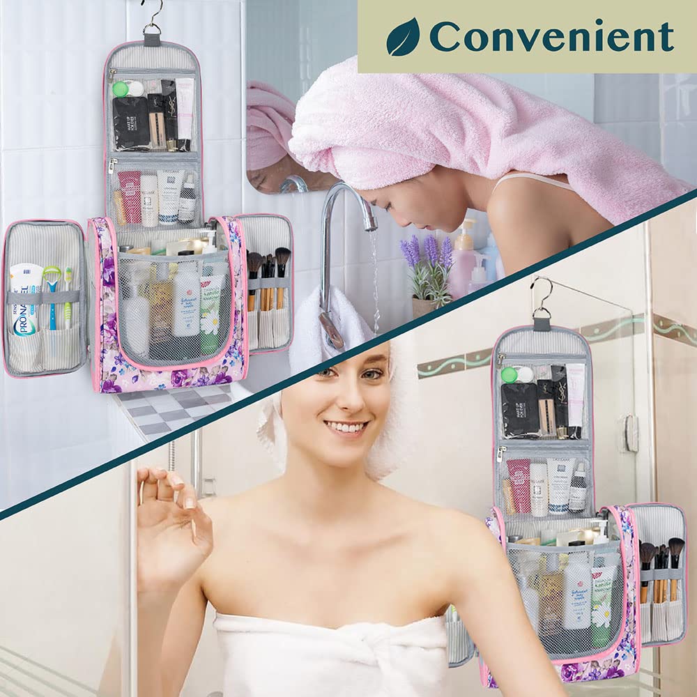 - COSMETICS TRAVEL BAG ORGANIZER: This toiletry bag for women has a hanging hook and multiple pockets that help you stay organizer during business trip, vacation travel. The hanging hook makes it easy to hang the toiletry bag to bars in the hotel shower bathroom. Unzip your toiletry bag to reveal compartments to organize your shampoo, skincare face hygiene products. This toiletry travel bag is an essential accessory for cruise in Europe, plane, Hawaii Trip, and honeymoon.