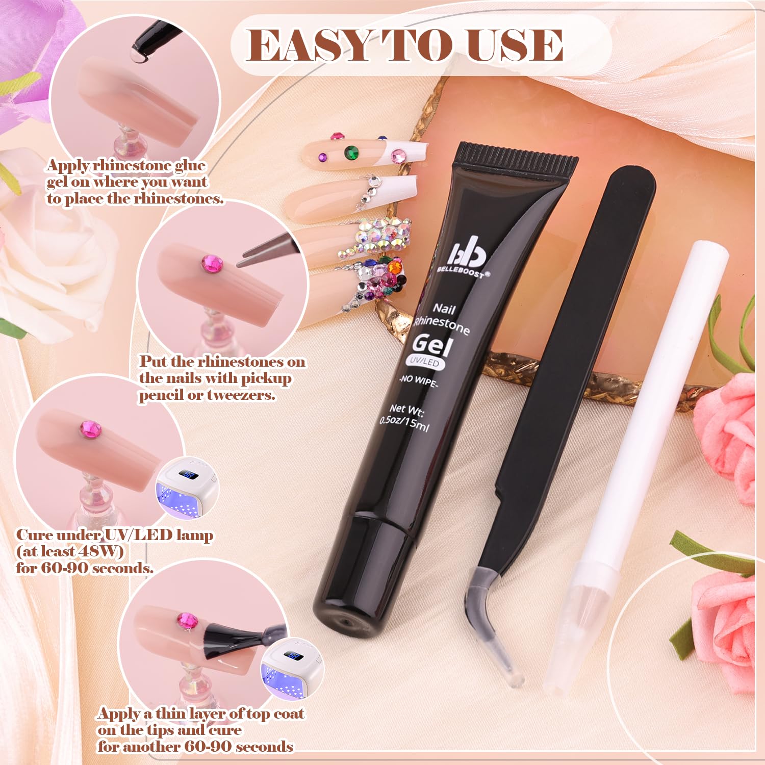 - NO WIPE TUBE DESIGN GLUE: For your better experience for nail art decoration, the tube glue gel is very easy to squeeze and dot directly to the place you want to stick gems with no mess. It is easy to control the amout for sticking both big and small stones. This nail glue gel is much easier to carry and store with no leakage.