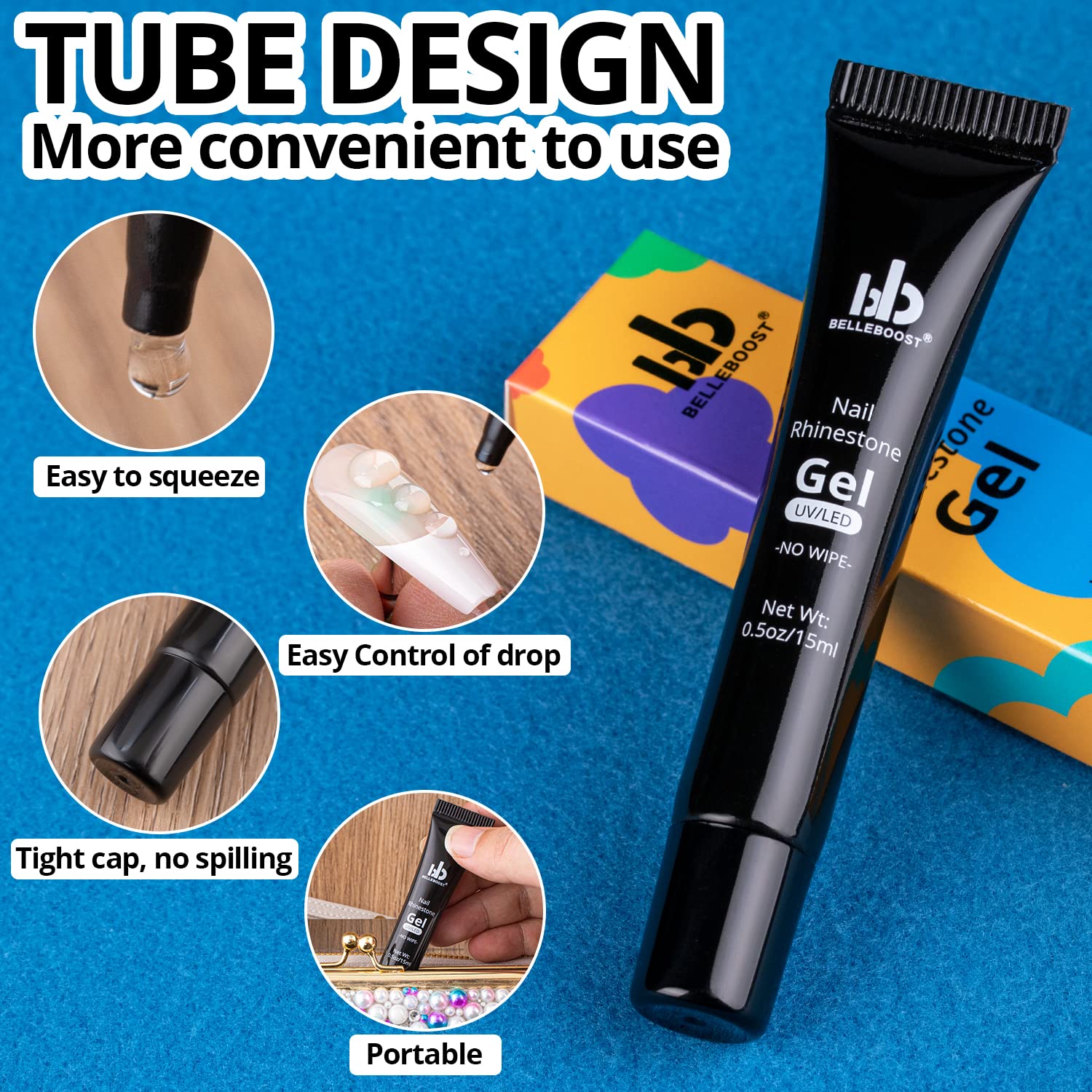 - 💎NO WIPE TUBE DESIGN GLUE: For your better experience for nail art decoration, the tube glue gel is very easy to squeeze and dot directly to the place you want to stick gems with no mess. It is easy to control the amout for sticking both big and small stones. This nail glue gel is much easier to carry and store with no leakage.