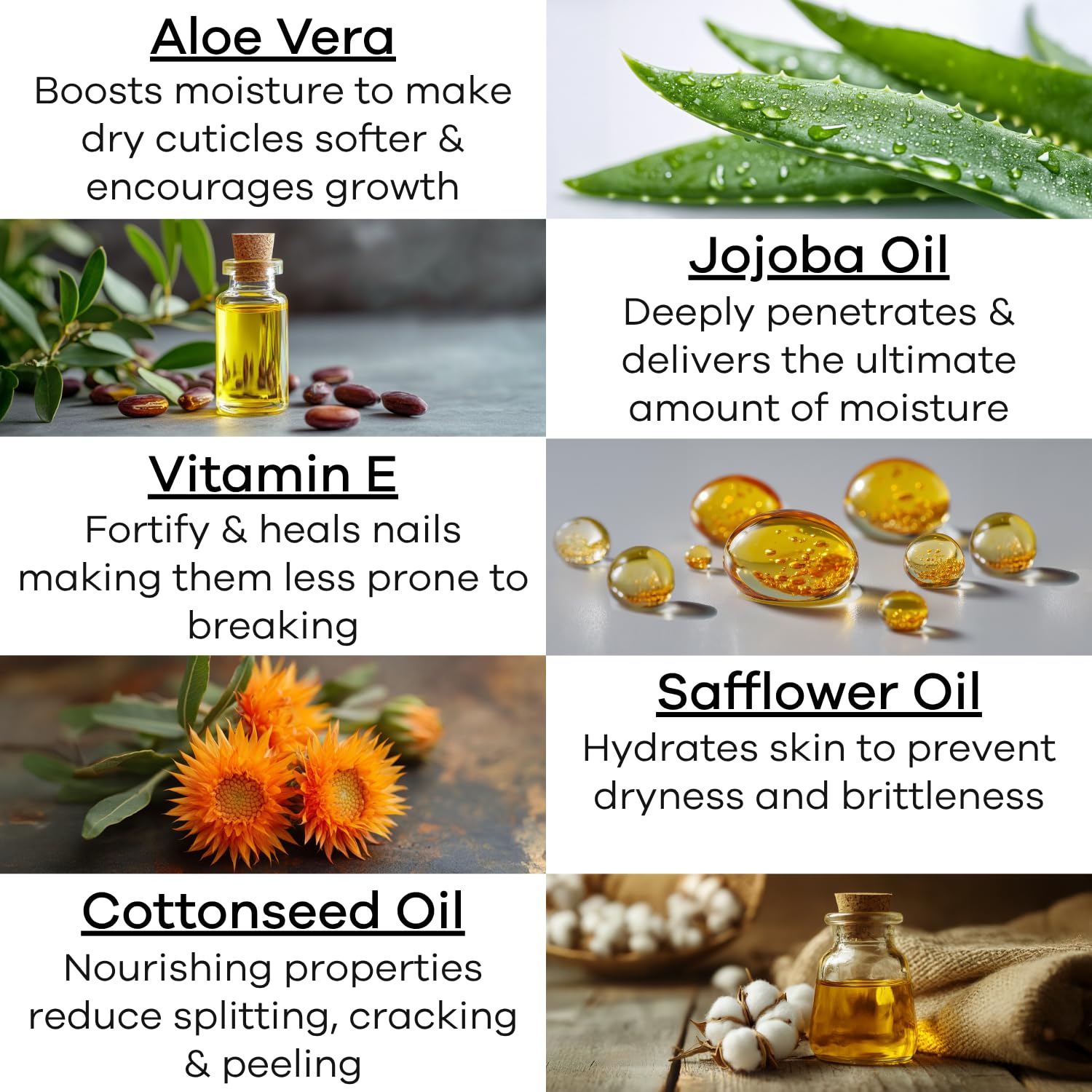 - Jojoba oil deeply penetrates & absorbs into the skin, helping to repair damaged collagen so cuticles can stay hydrated & nails can grow long & strong.