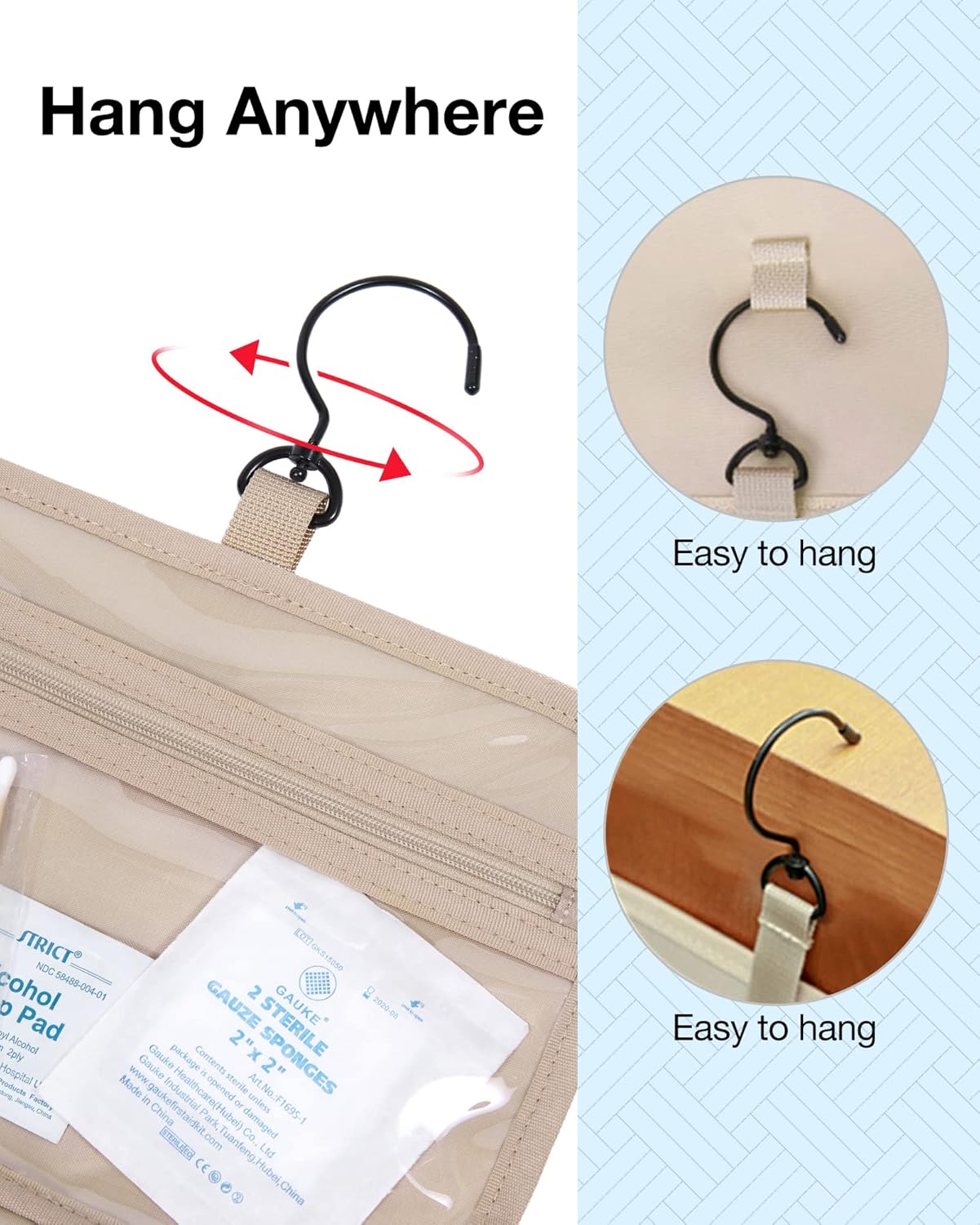 - ššØš§šÆšš§š¢šš§š ššš¬š¢š š§: Stow-away 360-degree swivel non-slip metal hook for versatile hanging options; carry handle doubles as its hanging strap; two-way zipper closure for quick access