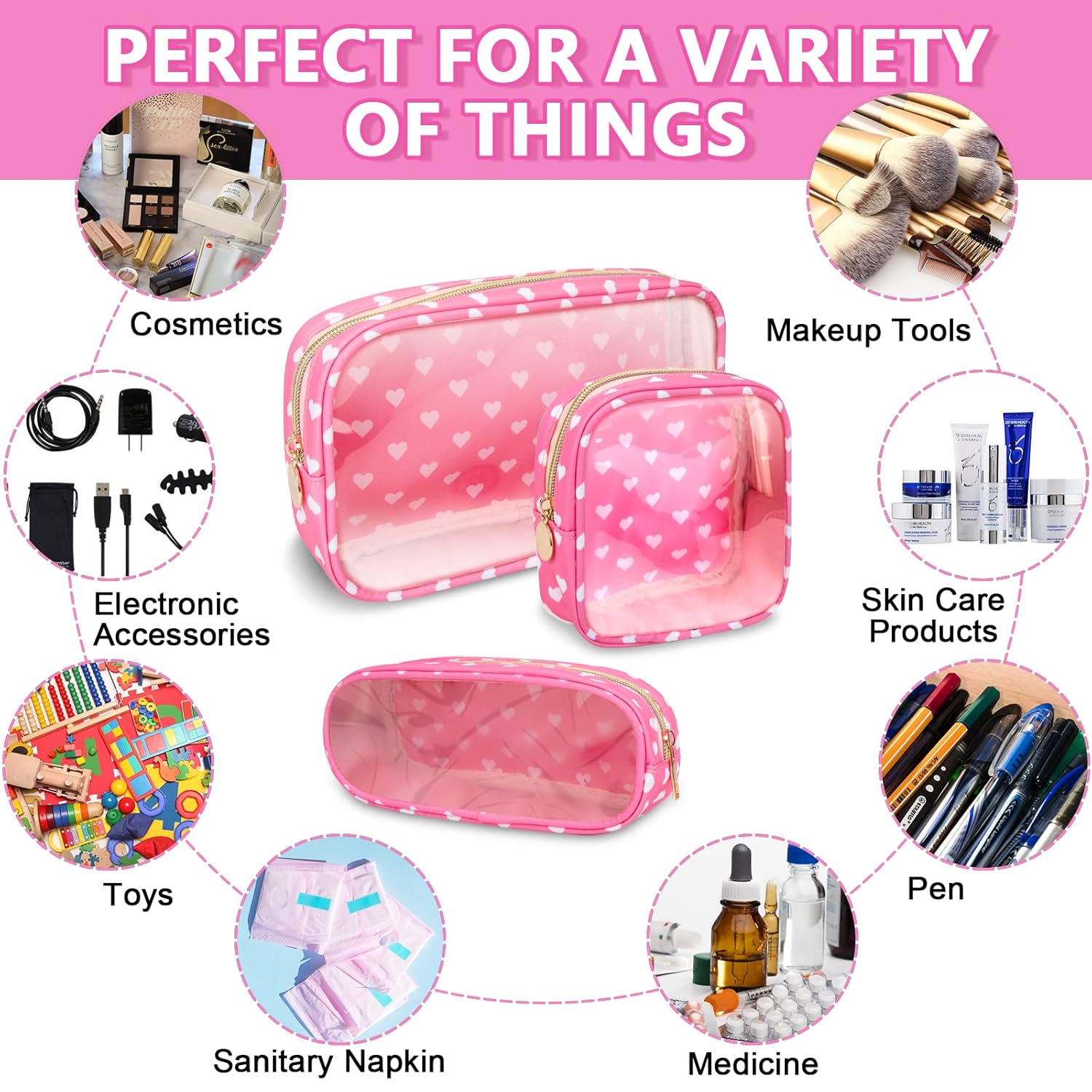 Clear Mini Makeup Bag for Purse, Small Nylon&PVC Cosmetic Travel Bag TSA Approved Toiletry Bag with Zipper, Preppy Transparent Makeup Travel Bag Coin Purse for Women Men Girls(Mini-Pink Heart)