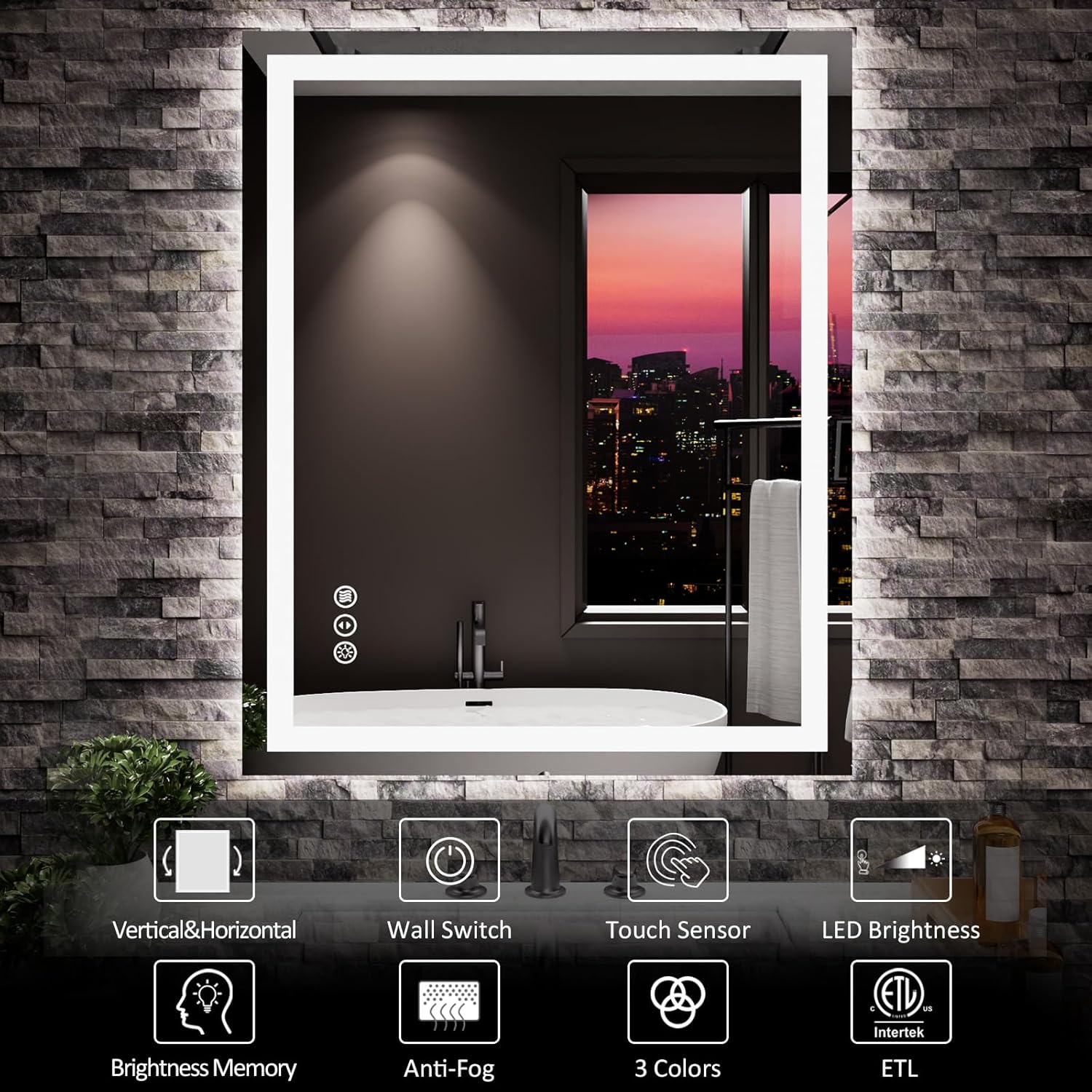 Amorho LED Mirror for Bathroom 24" X30" with Front Light and Backlit, Stepless Dimmable, Shatter-Proof, Memory, 3 Colors, Wall Mount (Horizontal/Vertical)