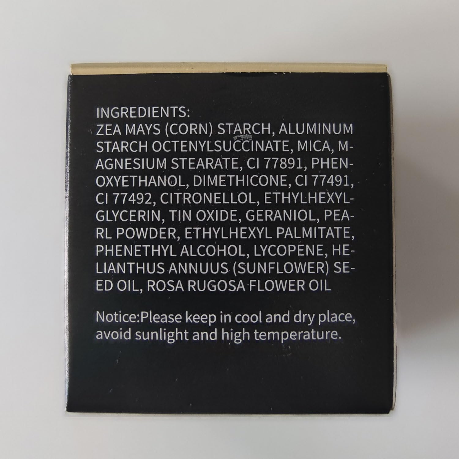 - [Various Plant Ingredients]-(1)Zea Mays (Corn) Starch: fine and smooth, with excellent moisturizing effect, making the skin more tender and delicate; (2)Pearl Powder๏ผnourish the skin and brighten the complexion; (3)Lycopene:a natural pigment contained in plants,which is conducive to skincare; (4)Rosa Rugosa Flower Oil: it can make your skin smooth and hydrated.