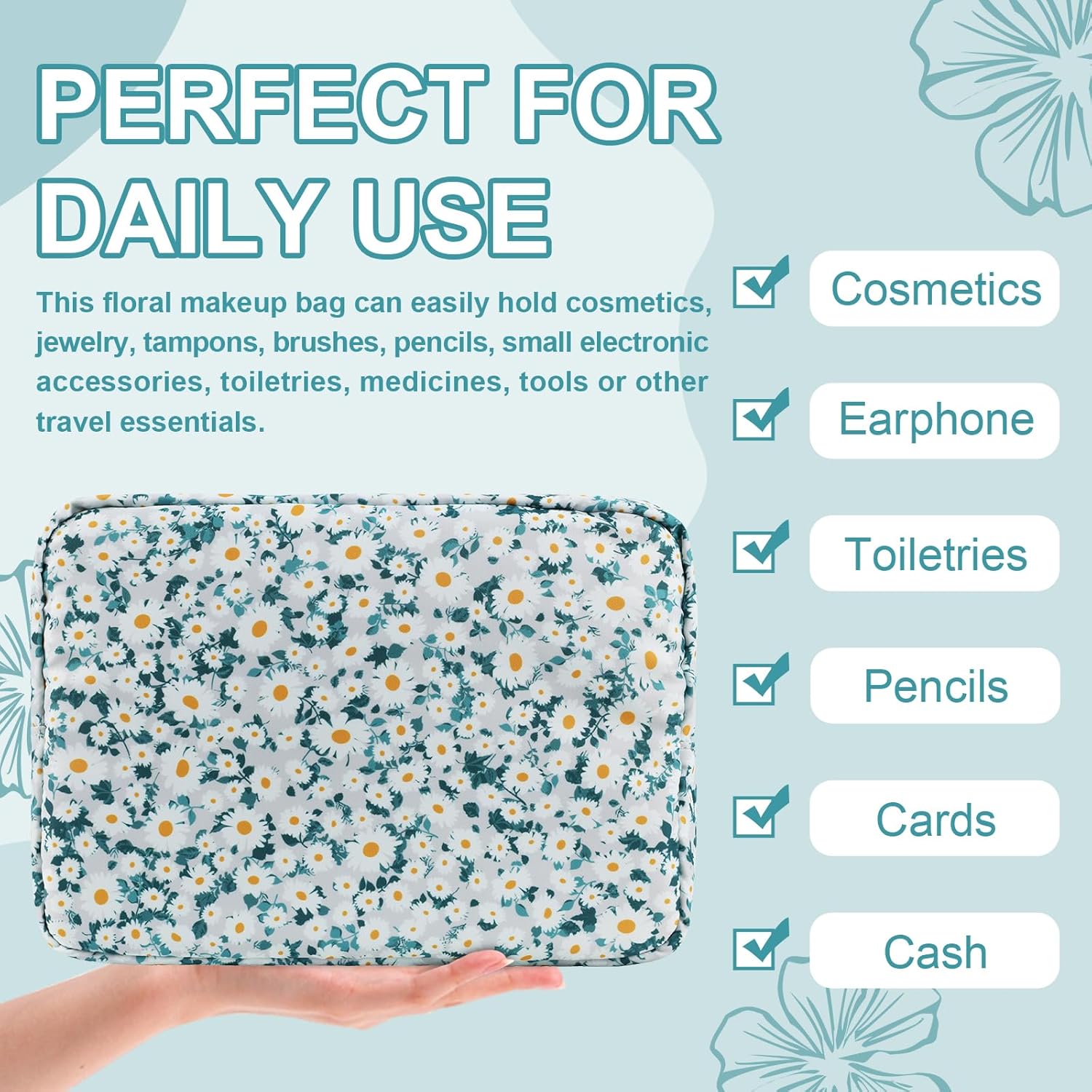 Waterproof Large Floral Makeup Pouch,Nylon Travel Toiletry Storage Purse Preppy Cosmetic Bag for Women Girl,Large Capacity Makeup Organizer Zipper Pouch for Work(L Green-Daisy)