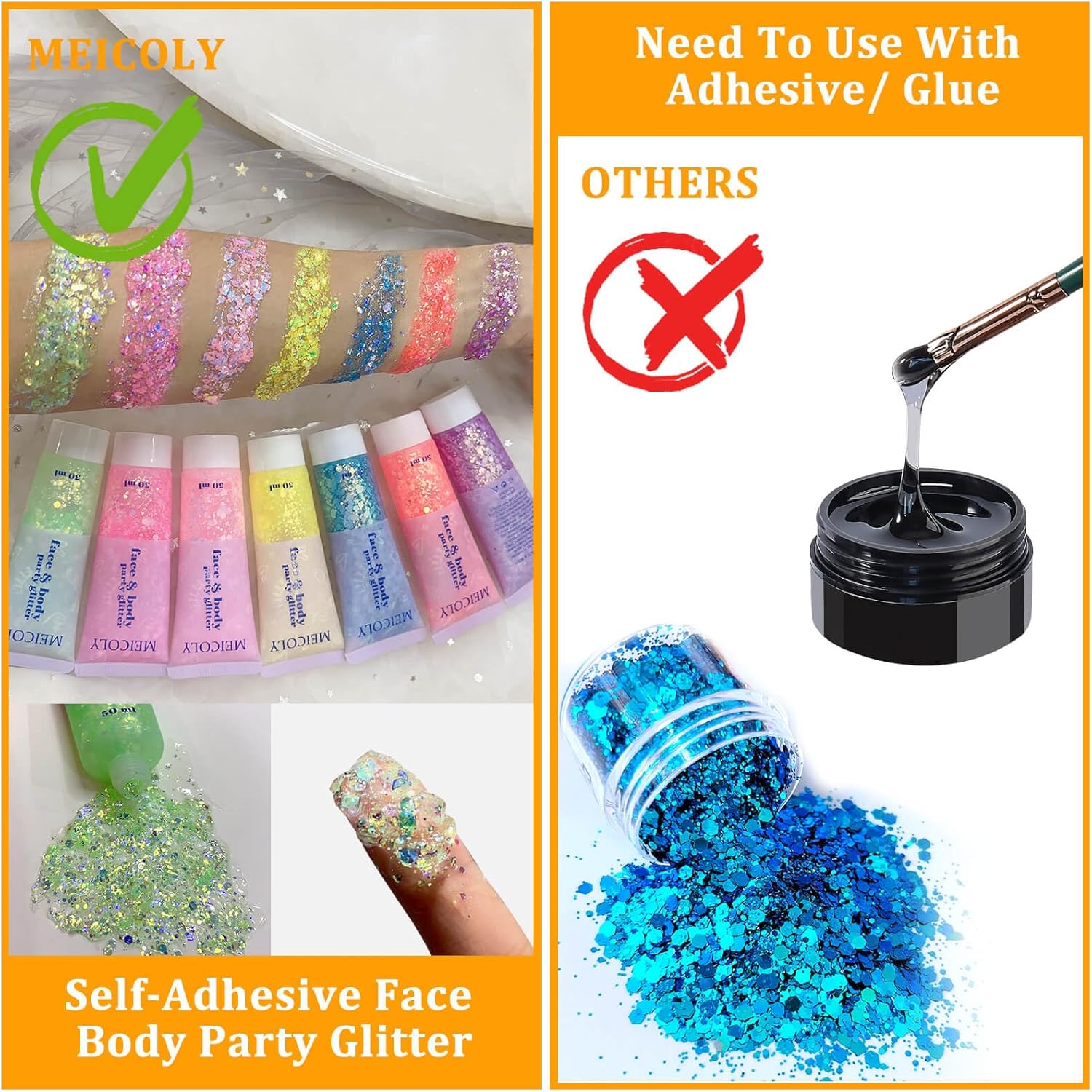 - Lightweight Glitter:MEICOLY chameleon face body glitter gel is lightweight,doesn't aggravate the skin when wearing it.Designed in tube package,easily control the amount of glitter, it spreads on easily and does not feel sticky on the skin
