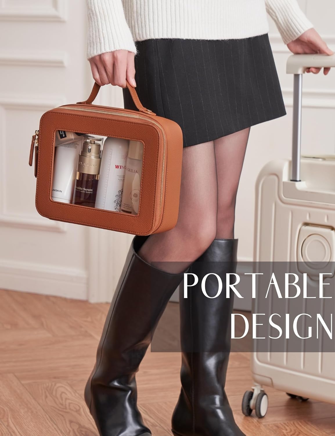 - [Spacious and Roomy] – The brown travel make up bag measures 9.6'' x 7.5'' x 3.1'' (24.5cm x 19cm x 8cm), ideal for extended trips or situations where you need to carry a comprehensive collection of makeup and skincare products. It is designed to fit comfortably in suitcases and big travel bags.