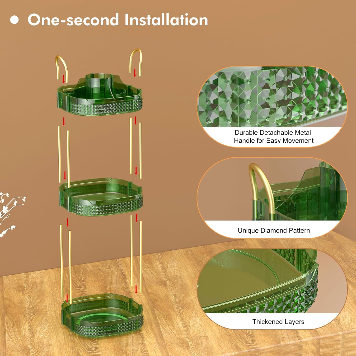 Awenia Rotating Makeup Organizer 360, Stackable Adjustable Large Capacity Cosmetic Storage Unit,Dresser Bathroom Kitchen Countertop Organizer with Metal Handle, Plus Size (Gem Green, 3 Tier)