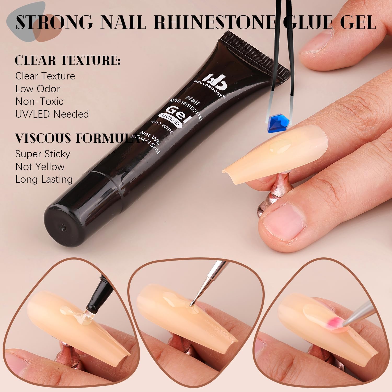 - 💎ADHESIVE GEL GLUE: The rhinestones glue gel uses a special, non-toxic and eco-friendly formula with strong tackiness, adhesion, and fluidity for easily applying decorations. It is a type of UV gel glue. After proper curing under a UV/LED lamp, the glue dries clear with superior bonding strength that can last a few weeks without falling off. With the designed tip, you can easily and conveniently apply the glue to the nail bed or the surface of false nails.