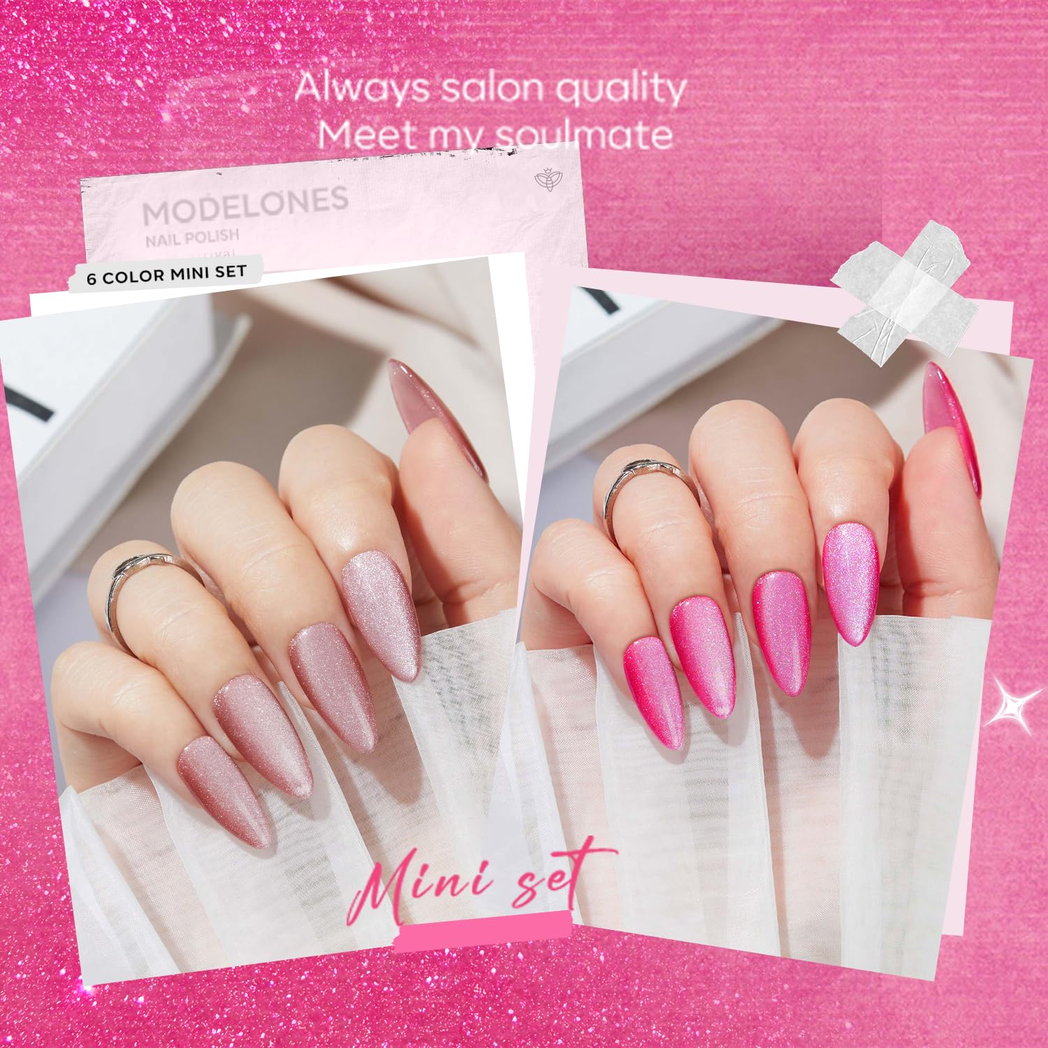 - Tips: Hold the magnetic stick 3-5mm above the surface for 5-10 seconds to achieve your desired effect! [ What You Get]: Black Red Colors of Semi-transparent Holographic Glitter Cat Eye Gel Nail Polish (5 ml/ 0.17 fl. oz each) + 1 Magnetic Stick for various cat eye designs. Each shade of Modelones cat eye nail polish is expertly mixed with metallic magnetic glitter powders for a stunning, shiny finish. Different angles create different visual effects. Practice makes perfect!