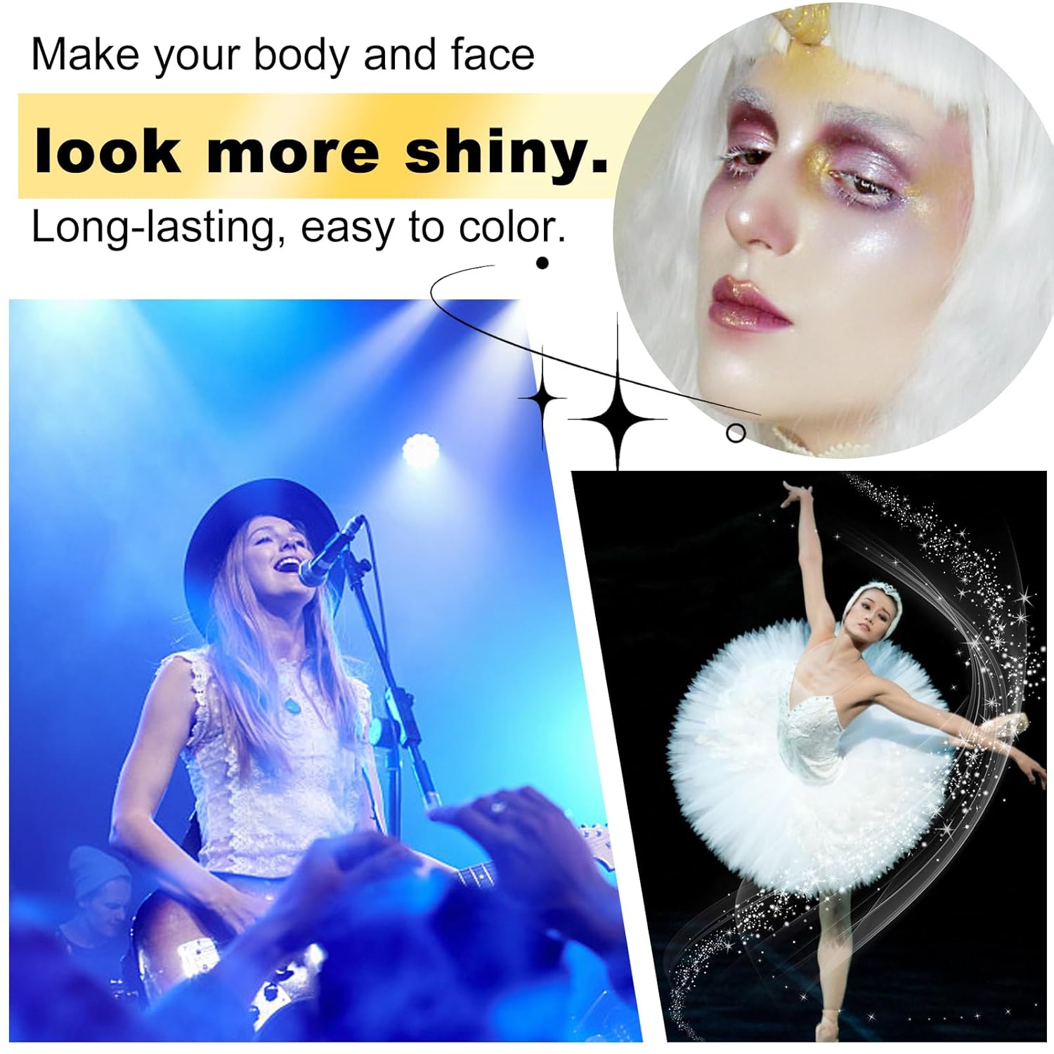 - ⦠EASY ON & EASY OFF -- Ideal for all skin types, it offers a quick-drying finish for instant luminosity, works as a body highlighter and gives your skin an elastic glossy glow. Apply with your hands or use a brush to evenly spread onto skin wherever you want to shape and highlight. When it's time to wash off, a little soap and water will do the trick, leaving your skin fresh and clean.