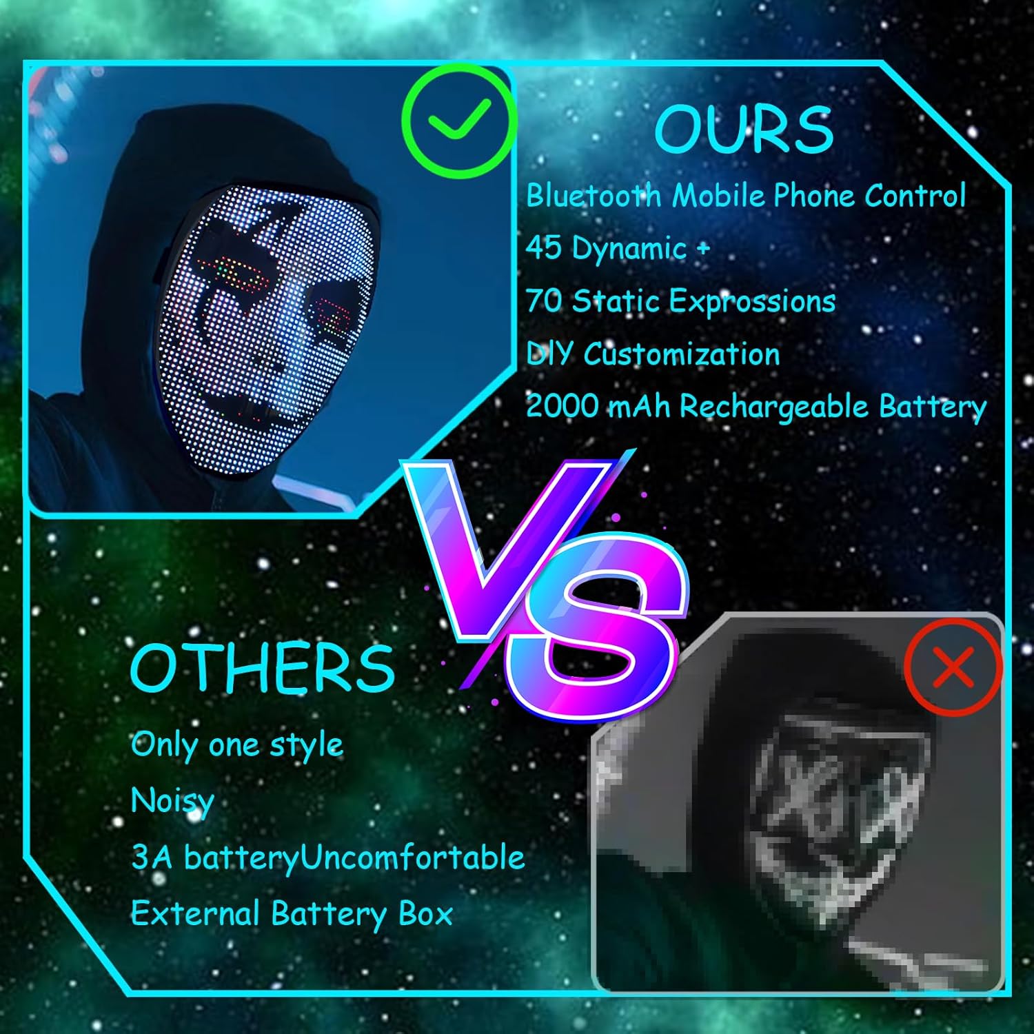 - Led Mask With 115 Patterns:Light up mask has 45 groups of dynamic patterns and 70 groups of static patterns,The mask uses higher brightness 2074 pieces of 2121RGB led light beads,Unique shape with gorgeous Led lights,making you stand out from the crowd