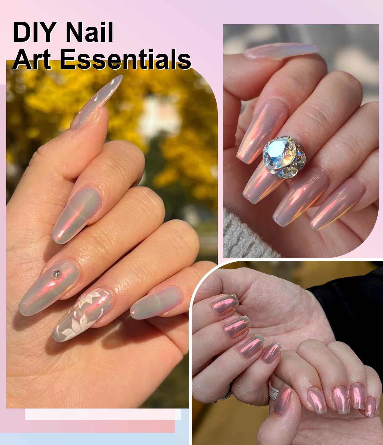 - Mirror Effect: BISHENGYF unique mirror effect white pearl chrome nail powder design of the pink glitter series chrome nail powder can not only significantly enhance the sense of fashion and individuality of nail art,but also clear chrome nail powder add a touch of unparalleled glamour and fun to your overall look.