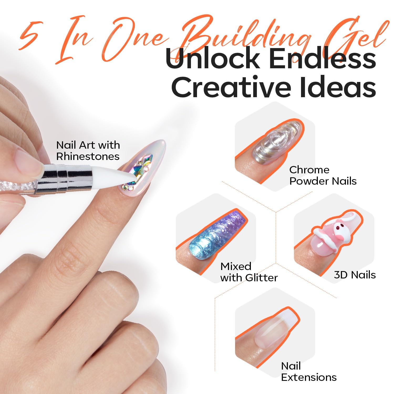 - Quick & Easy Application: High self-leveling formula along with built-in brush makes it easy to spread, This gel builder for nails can be used for nail extensions, sculpting, mixing chrome powder, glitter and nail rhinestones decoration. This upgraded sculpting gel for nail art is soft, non-sticky, and solid texture. Soft material can be kneaded into any shape or other decoration, allowing you to create various 3d nails