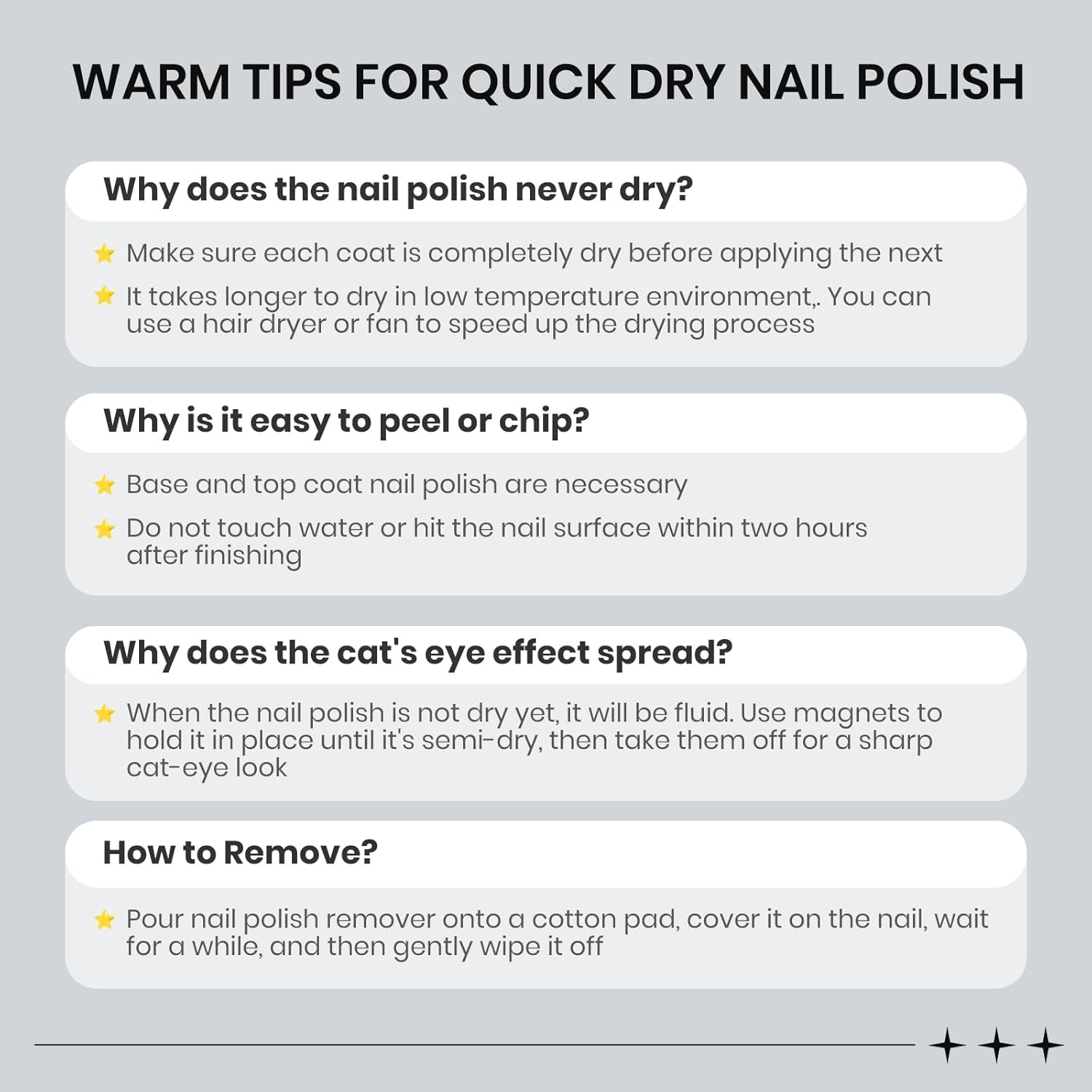 - Important Tips: 1. When the nail polish is not dry yet, it will be fluid. Use magnets to hold it in place until it's semi-dry, then take them off for a sharp cat-eye look 2. Do not touch water or hit the nail surface within two hours after finishing to avoid peeling; 3. Base and top coat nail polish art necessary