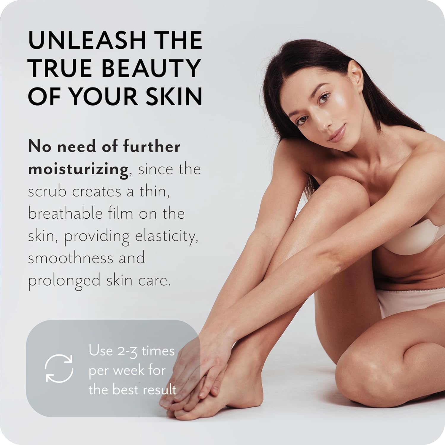 - š„„ Powerful Plant-Based Oil Complex: Body scrubs for women contains valuable oils like coconut, sweet almond, avocado, and shea butter. Coconut oil nourishes the skin, retains moisture, and accelerates cell regeneration. Sweet almond oil deeply moisturizes and restores the lipid barrier. Avocado oil reduces inflammation, while shea butter enhances skin firmness and elasticity, slowing down the aging process.