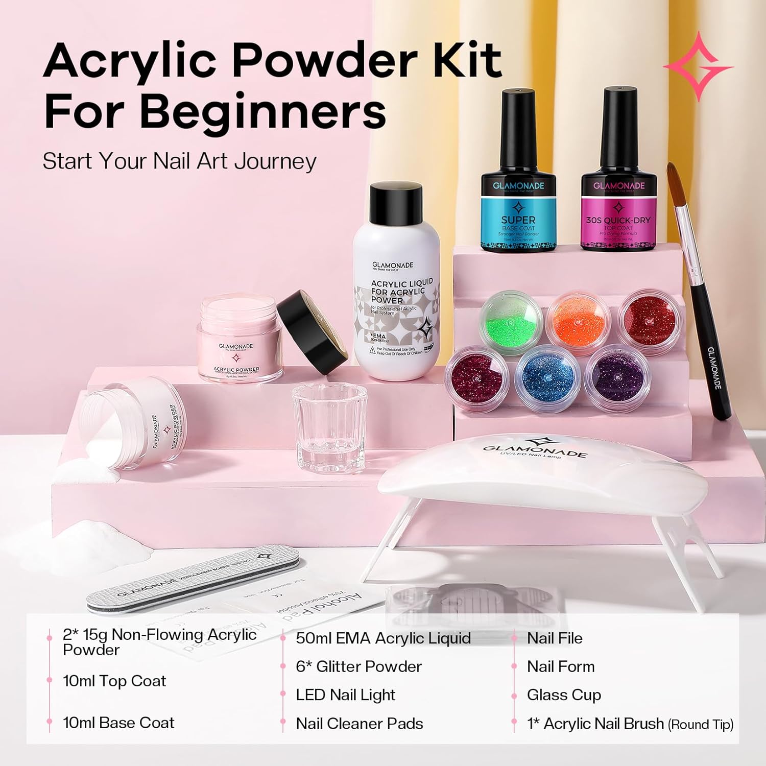 - Included Components : Acrylic Powder, Acrylic Liquid, Base Coat, Top Coat, LED Nail Lamp, Acrylic Nail Brush Pen, Glitter, Glass Container, Nail Cleaner Pads, Nail Forms Acrylic Powder, Acrylic Liquid, Base Coat, Top Coat, LED Nail Lamp, Acrylic Nail Brush Pen, Glitter, Glass Container, Nail Cleaner Pads, Nail Forms