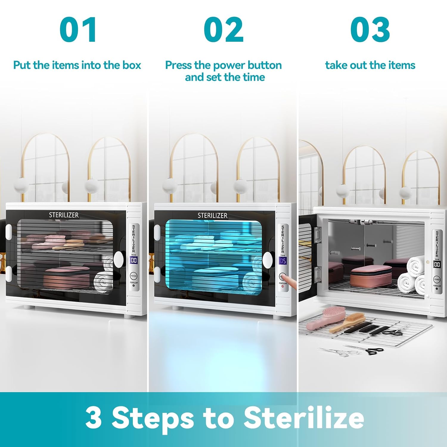 - Wide range of applications: The U&V Care Cabinet is not only suitable for home use, but can also be used in salons, barber stores, tattoo parlors, nail salons and beauty salons. It can clean Salon Tools, Nail Clippers, Cell Phones, Watches, Glasses, Baby Toys, Makeup Tools, nail tweezers, eyebrow scissors, towels, tableware, plastic toolsοΌ makeup, jewelry, earbuds, keys, pacifiers, toothbrushes and more.