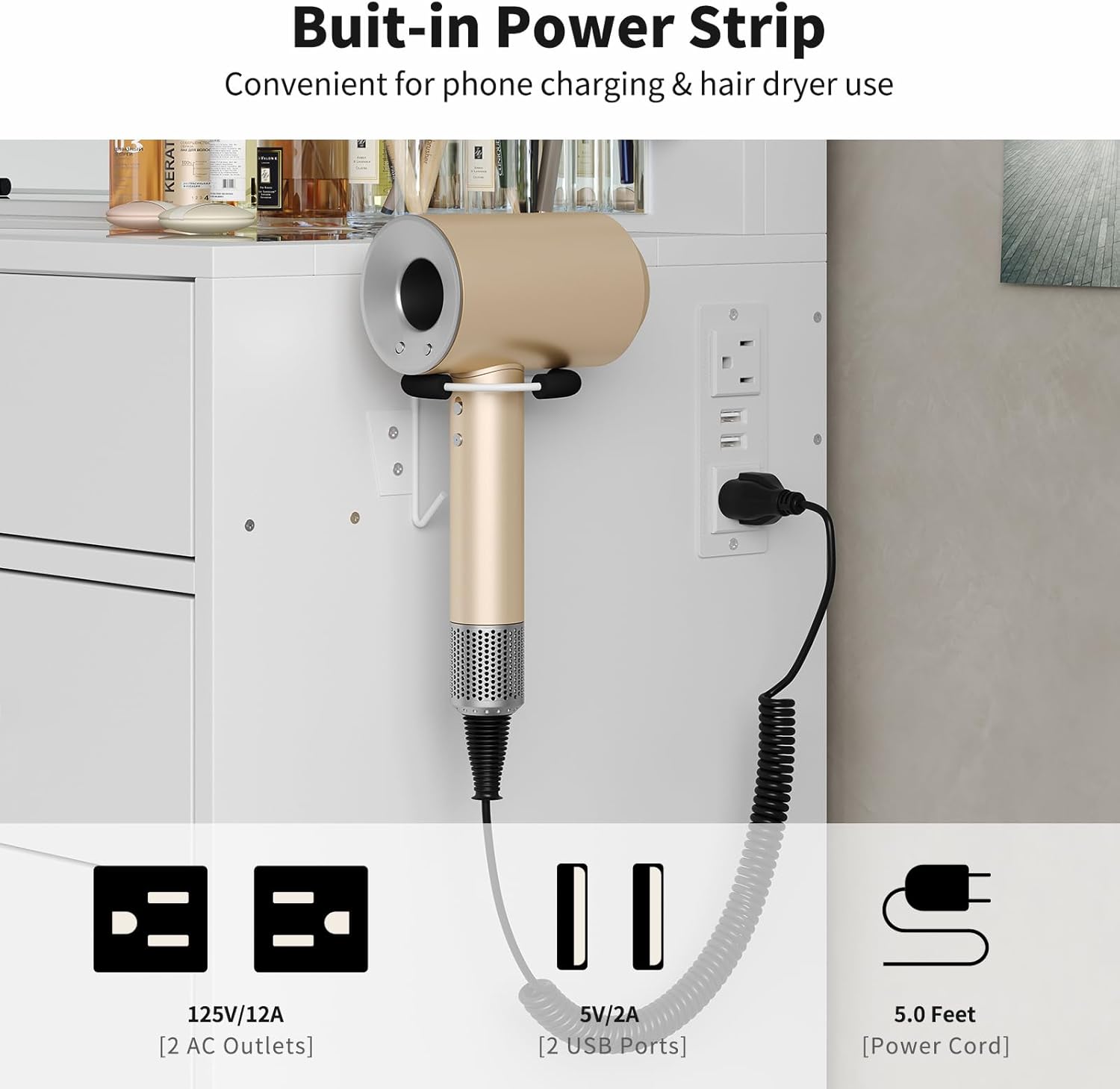 - Convenient Power Station๏ผStay charged and connected with the built-in power outlet, featuring a dedicated hairdryer rack along with 2 standard plug sockets and 2 USB ports. This makeup vanity allows you to power up your devices or styling tools while you effortlessly create your perfect look