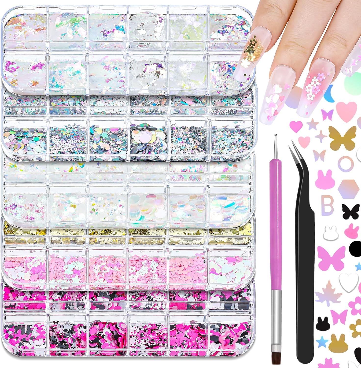 5 Boxes 60 Colors Holographic Nail Art Sequins Kit, Iridescent Sparkle Laser Hollow 3D Star Butterfly Heart Round Mixed-shapes Nail Glitter Flakes for Manicure Body Makeup Craft DIY (2-colorful-kit2)