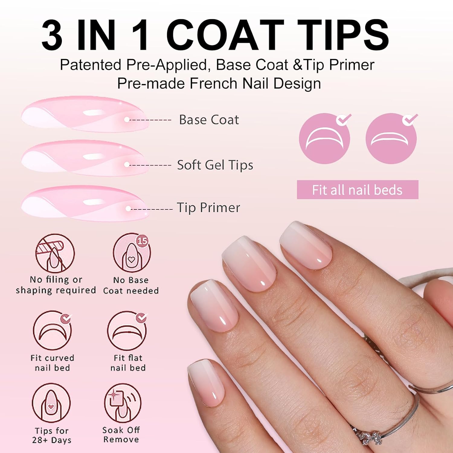 Ombre Press On Nails - 240Pcs Square Short Press on Nails, White Nail Tips Pink White Gradient Soft Gel False Nail Tips Salon Perfect Fake Nails Kit Extensions DIY (Extra Short Square)