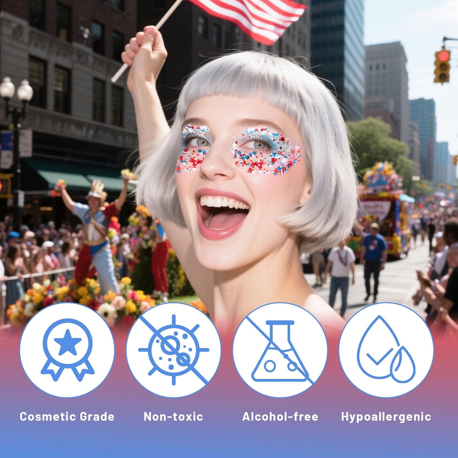 - Patriotic Face Glitter:Consisting of red, white and blue glitter that can be used on the face or body, the special color scheme adds patriotic color to the 4th of July oufit. The color and shine of the glitter will change with the viewing angle, just as fascinating as a rainbow.