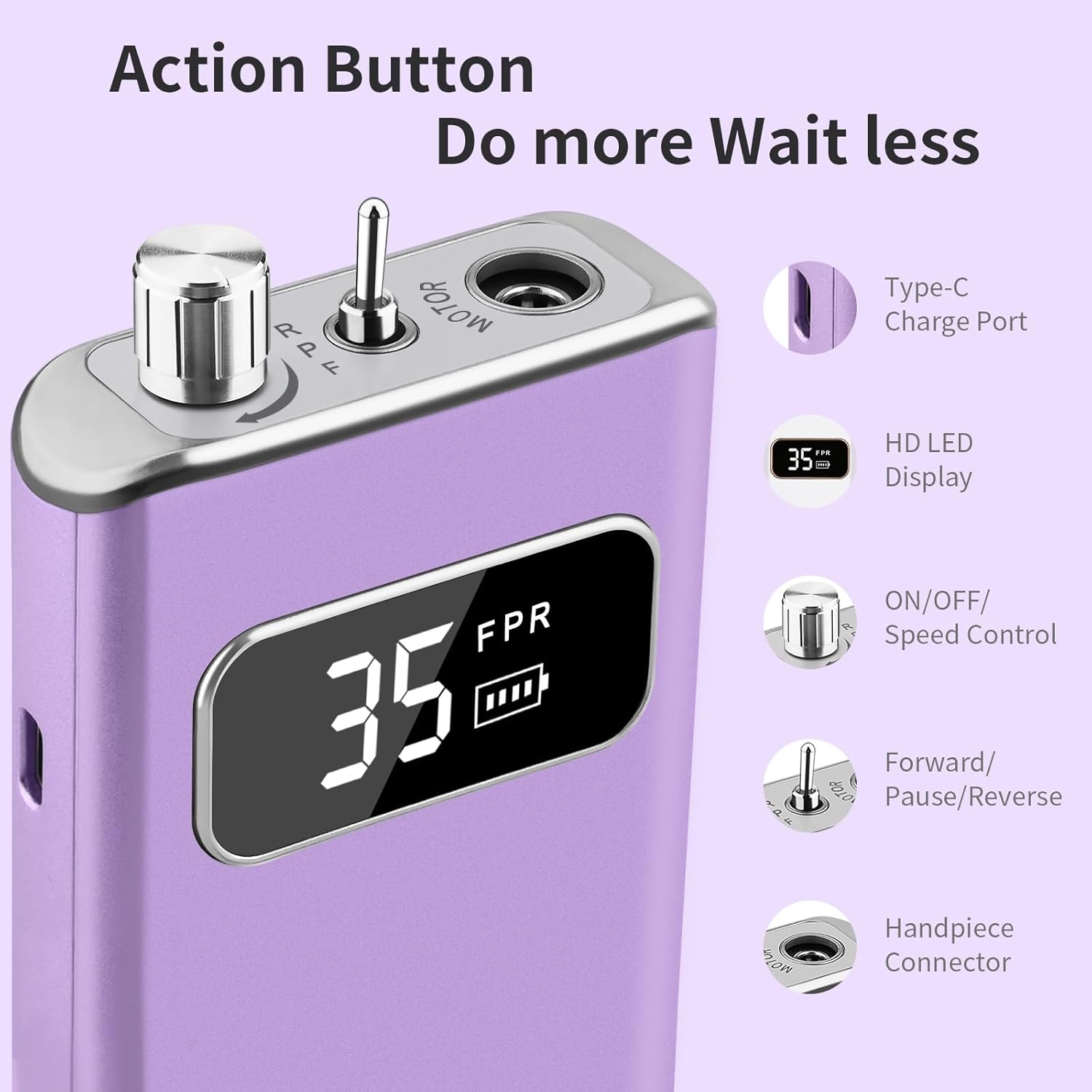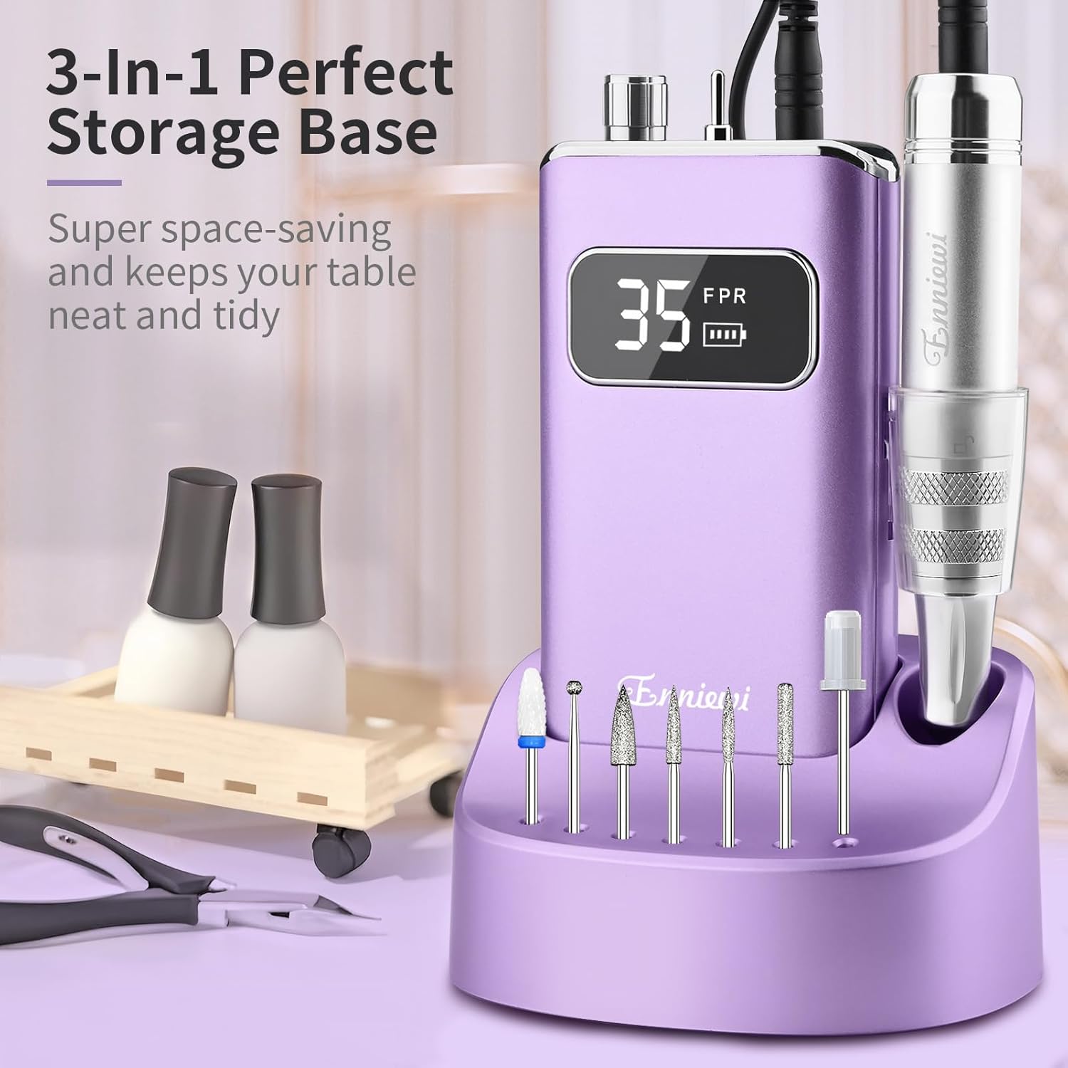 - 【Cordless Use & Compact Design】Built-in 2000mAh rechargeable battery capacity. With 2-hour fast USB-C charging, it delivers 5-6 hours of continuous runtime. Features a glossy-finish silver alloy frame with elegant purple body, exuding noble and mysterious vibes. Plus the back belt-clip + side mounted handpiece holder for hands-free portable carrying. Meet nail technicians' and home DIY enthusiasts' pedicure/manicure needs anytime, anywhere!