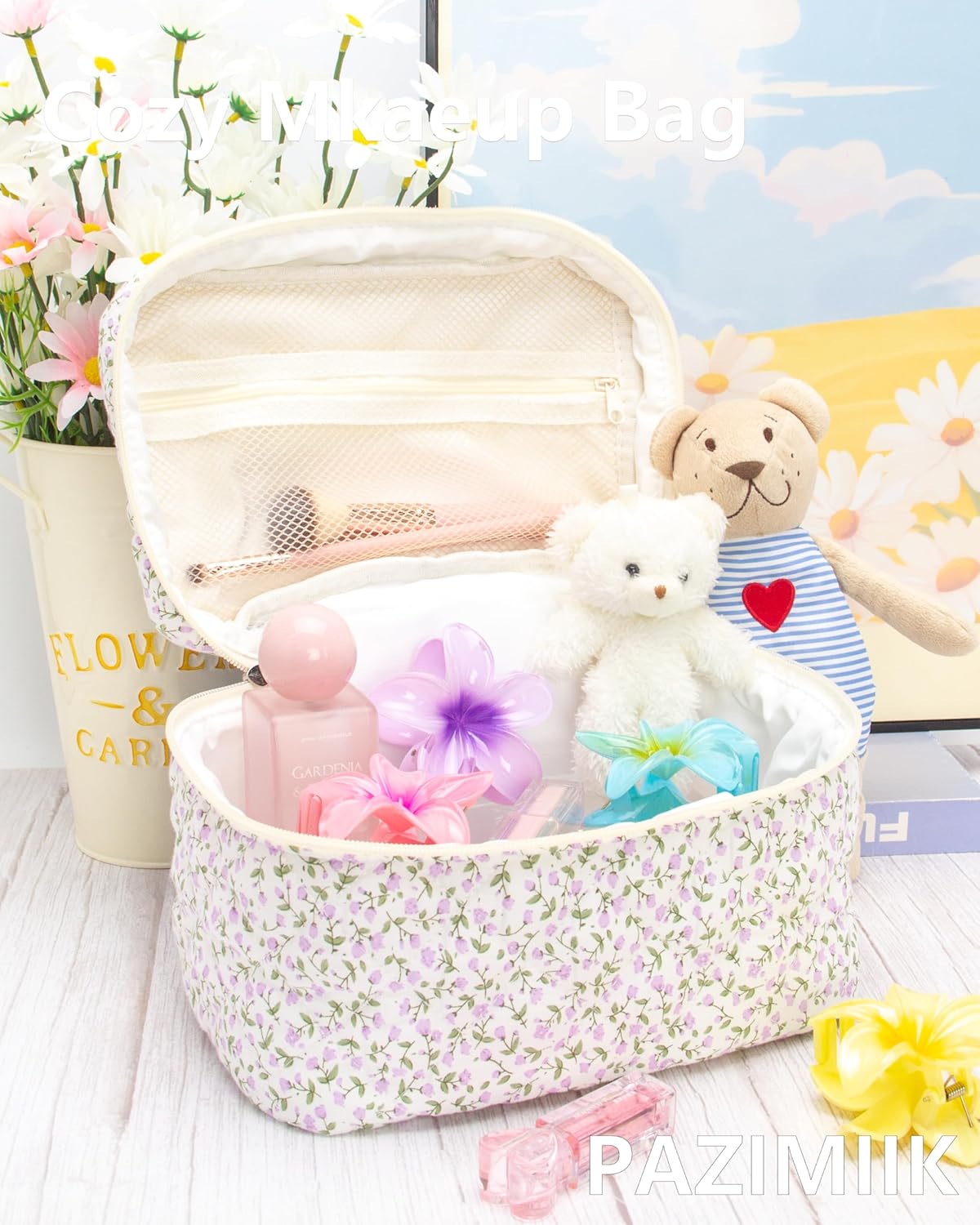 PAZIMIIK 3PCS Makeup Bag SET Large Travel Quilted Zipper Soft Cosmetic Case Pouch for Women Girls Make Up,Floral Purple