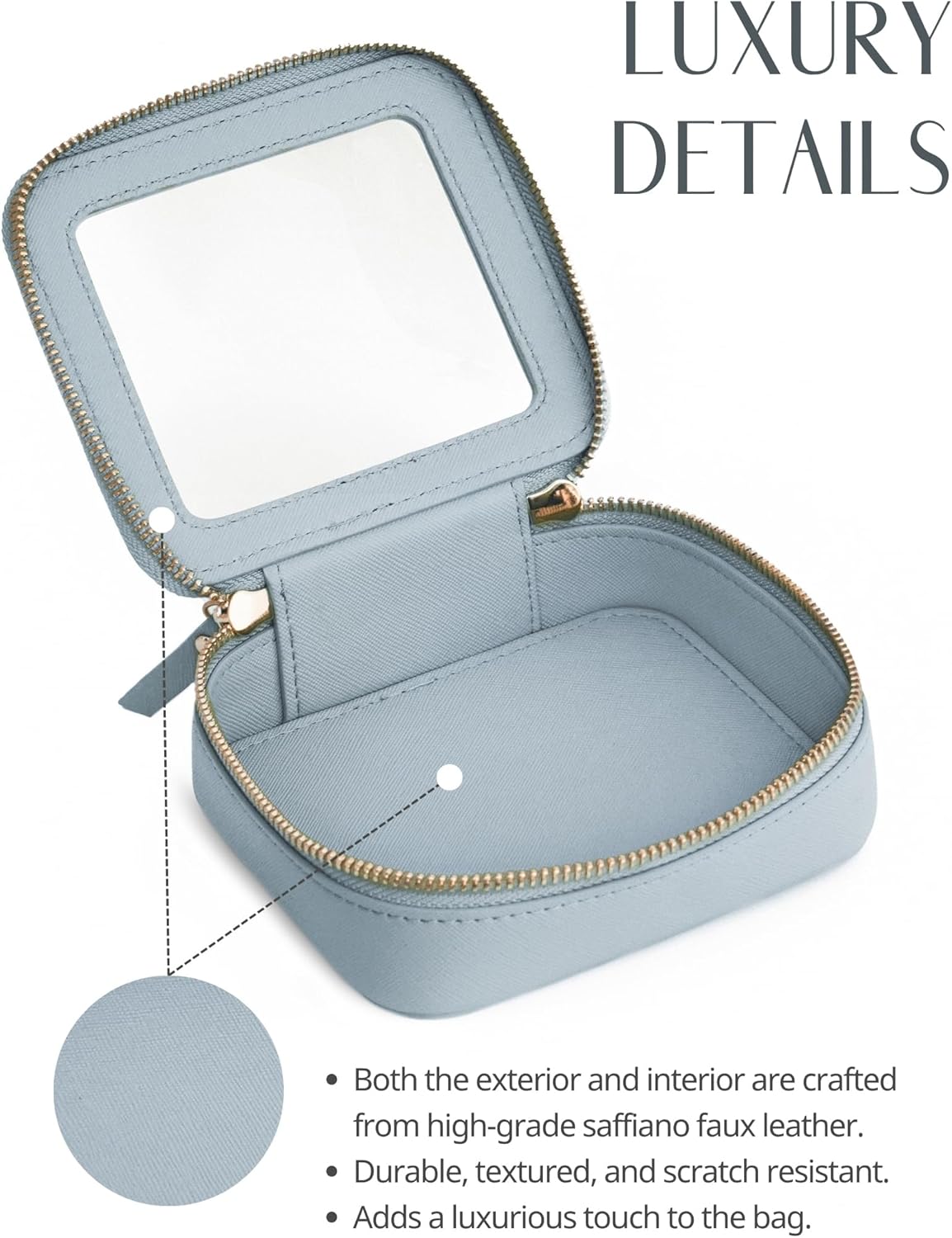 - [Premium Material and Durability] – The clear small cosmetic case, both the exterior and interior, is crafted from high-grade saffiano faux leather, which is highly scratch resistant, durable and exceptionally easy to keep clean. It features a smooth zipper for secure closure, and elegant light gold metal hardware accents, adding a luxurious and sophisticated touch to the bag's overall design.