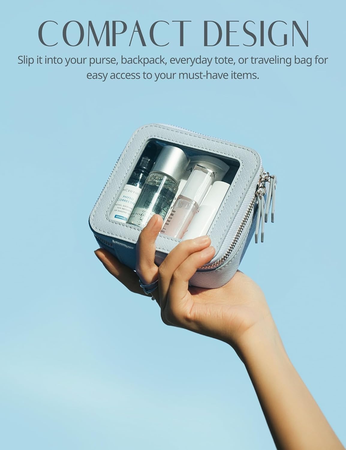 - [Mini but Mighty] – The blue mini makeup bag measures 5'' x 4.7'' x 2'' (12.7cm x 12cm x 5cm), perfect for holding daily mini essentials including lip balms, hair ties, jewelry, Air Pods, charging cords and medications. Slip it into your purse, backpack, everyday tote or travelling bag for easy access to your must-have items.