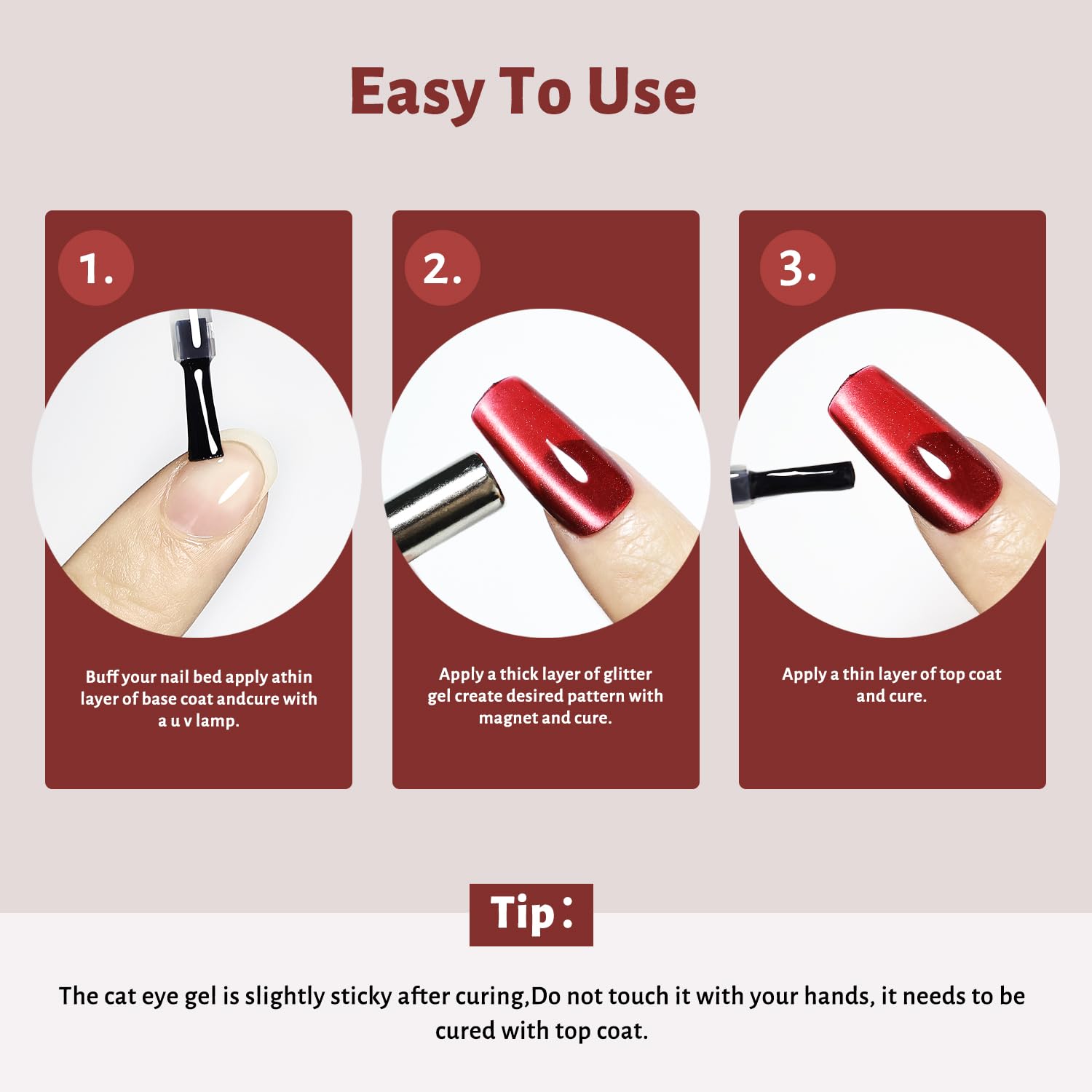 - You’ll Received:1Pcs Jelly (Burgundy Red/Dark Red) Cat Eye Gel Nail Polish.With the built-in Magnet, you can use the magnet to create desired pattern before curing.It creates a gorgeous momentum for your nails.( Need U V Lamp)