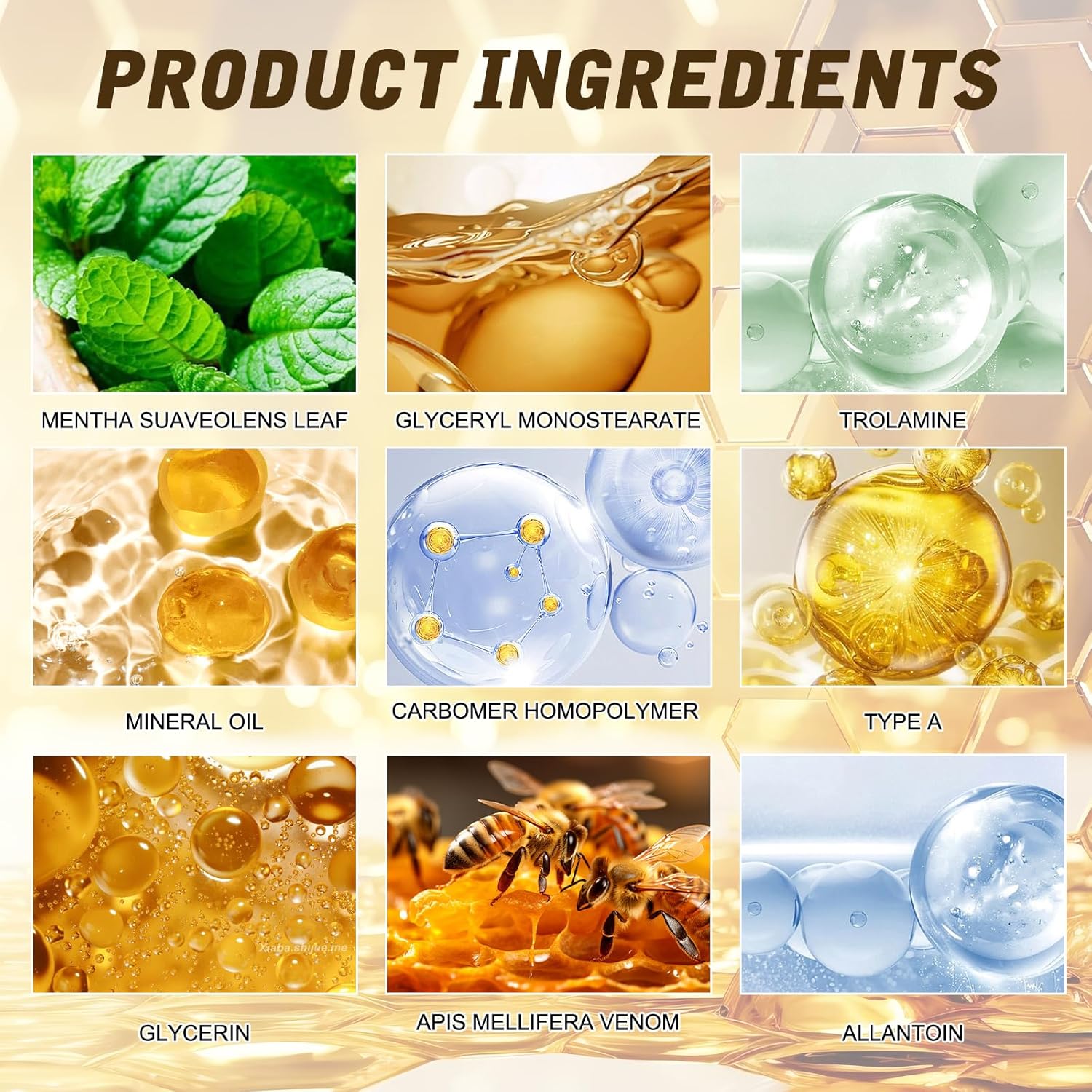 - Plant Extract Essence: Our Bee Venom Cream is made with high-quality natural extracts. The cream is gentle and suitable for all skin types