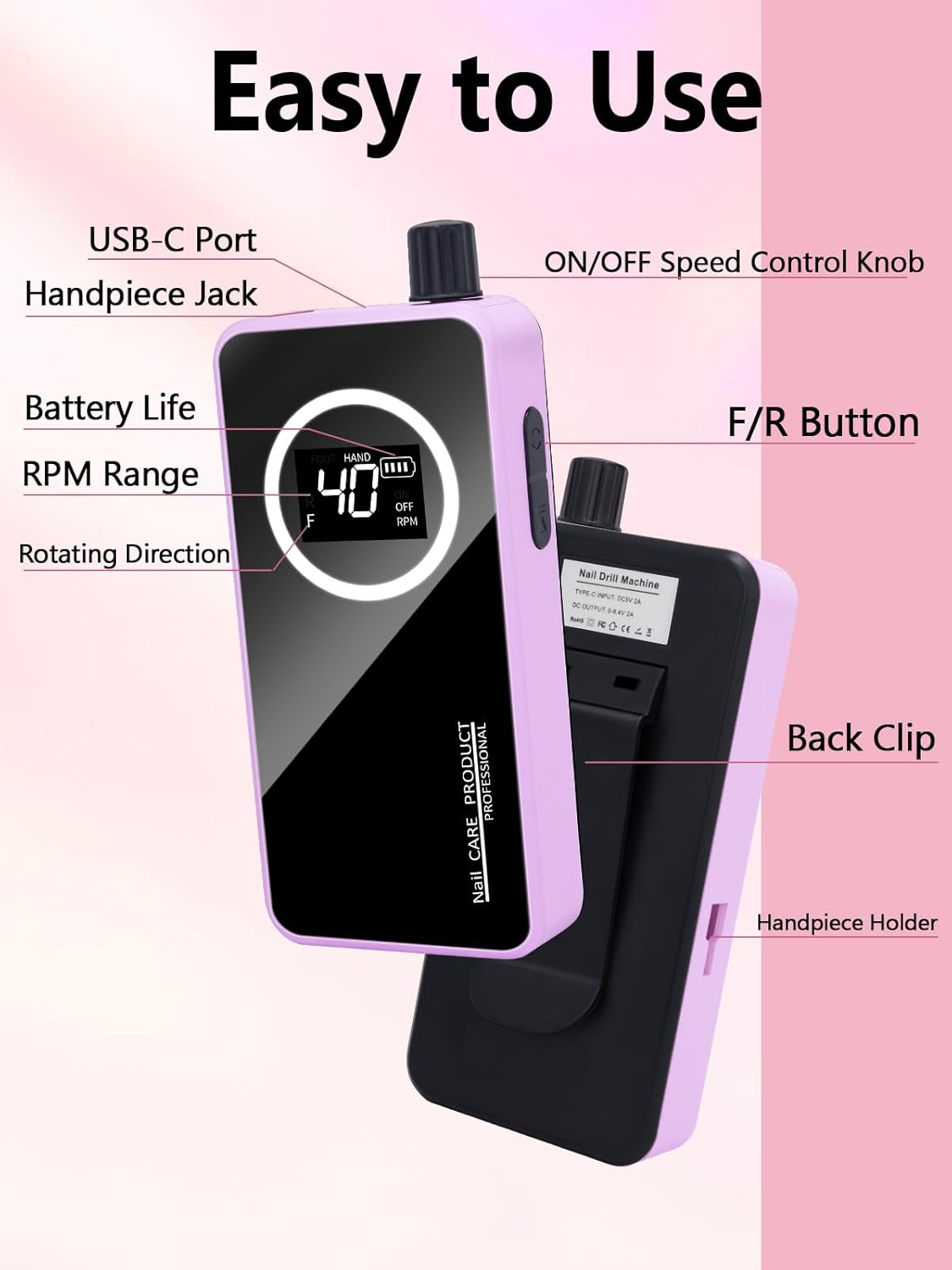 - ULTRA-QUIET BRUSHLESS MOTOR & LOW VIBRATION: The nail drill was advanced brushless motor delivers powerful, smooth performance with ≤45dB ultra-low noise and minimal vibration. The rechargeable nail drill machine is ideal for home use, travel, or professional salons without disturbing others