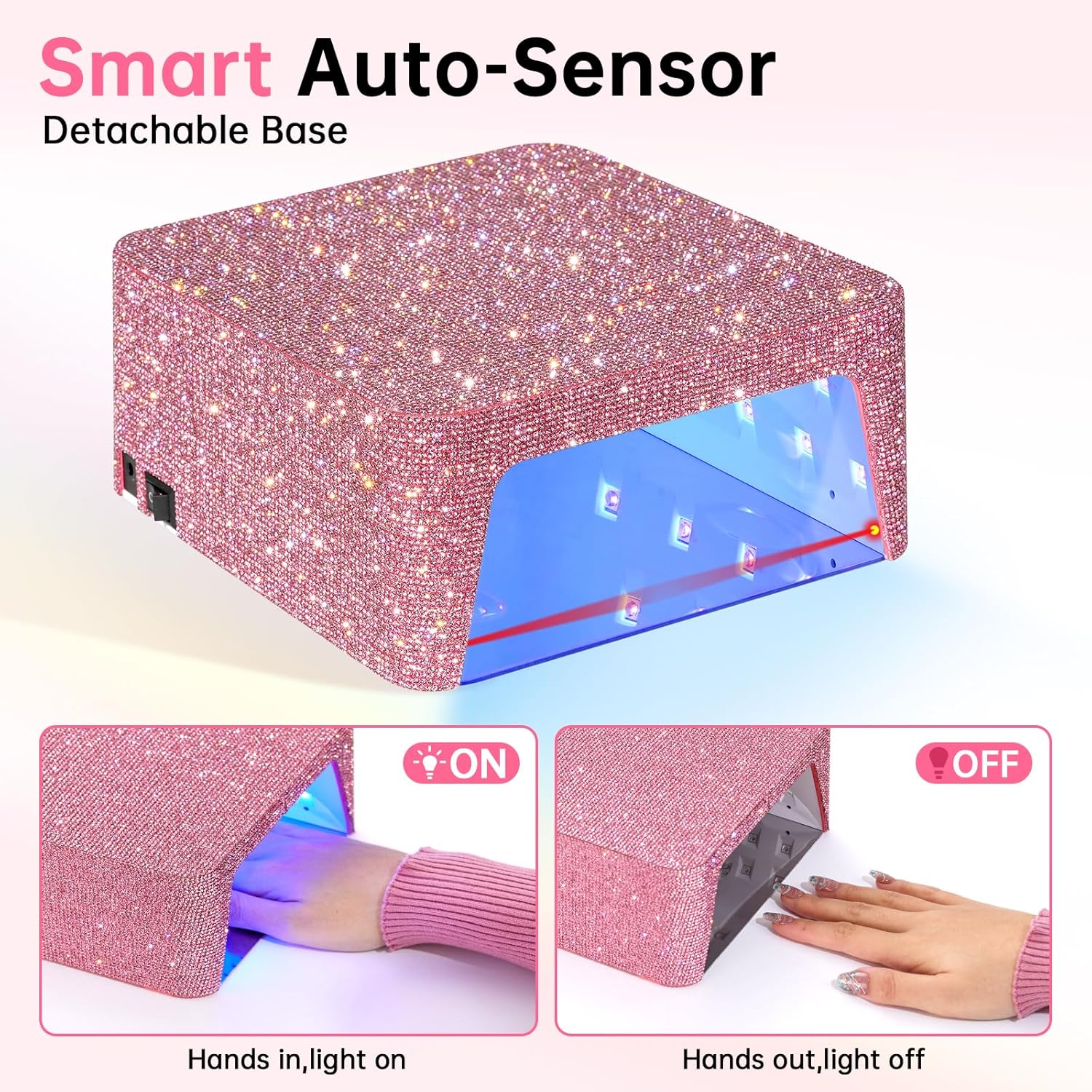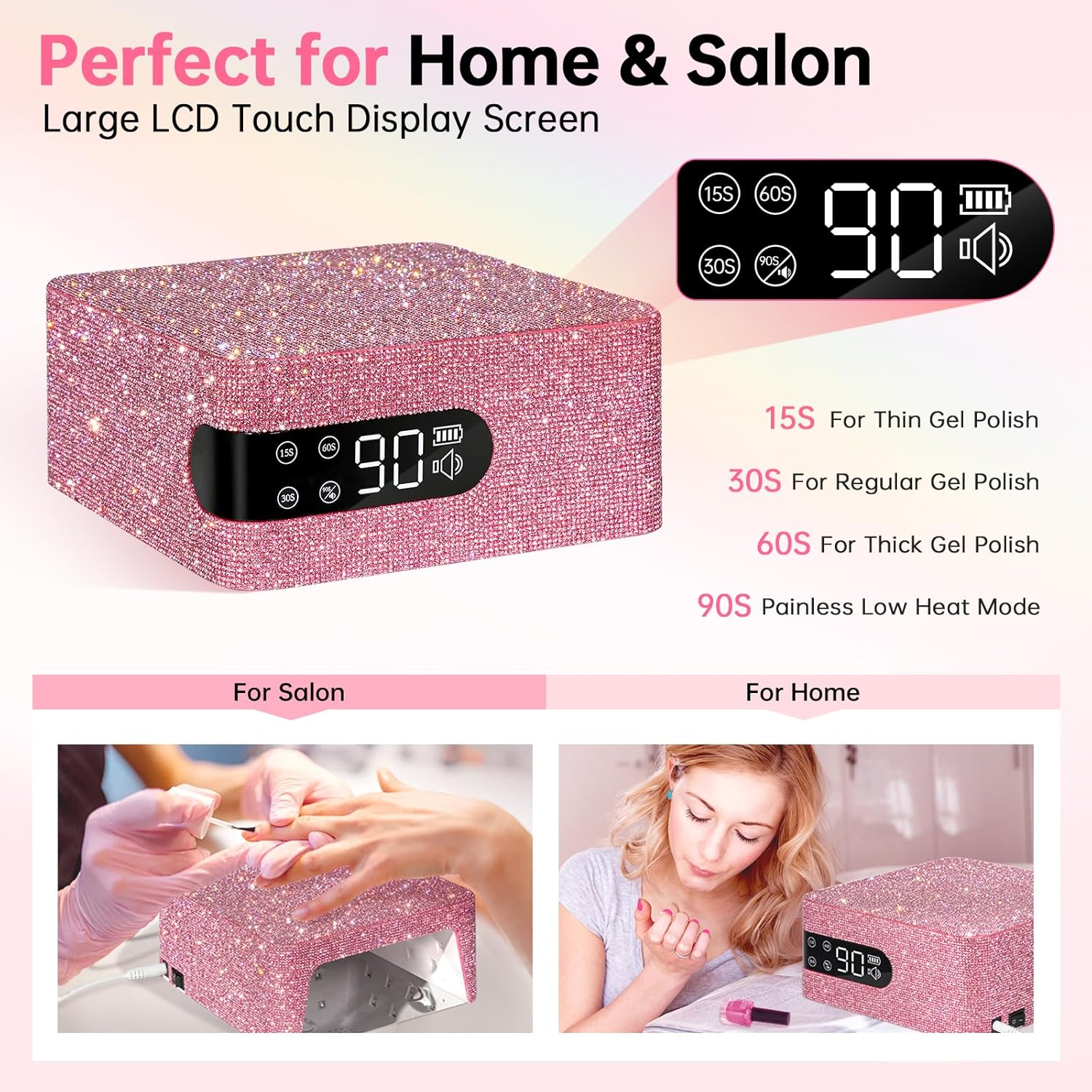 - 【User-Friendly】Our sparkly diamond nail lamp features a touch LCD display with 4 timer settings: 15s, 30s, 60s, and 90s. The infrared sensor lights automatically activate when your hand is placed under the flash cure lamp and turn off when it's removed, ensuring the curing process is efficient and time-saving