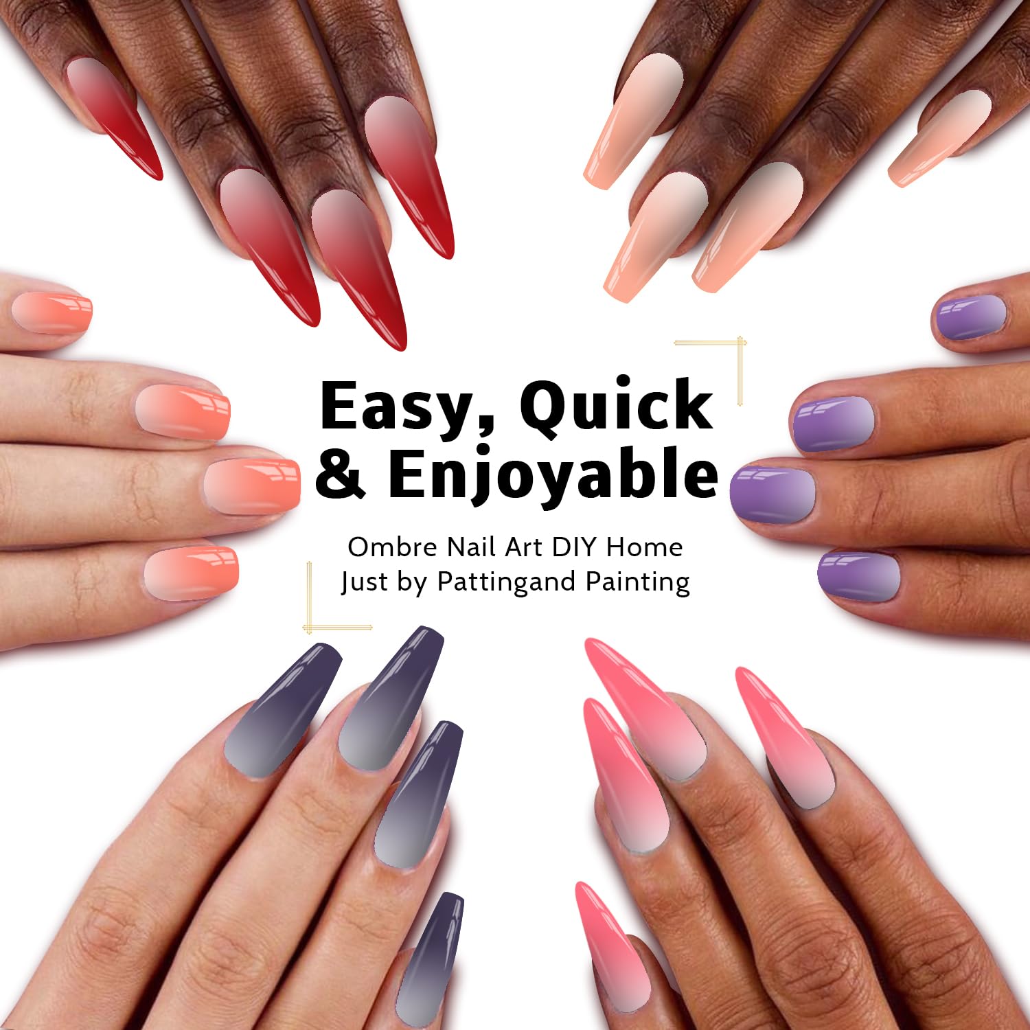 - 【EASY USE:】All steps are the same as normal UV/LED nail gel: 1.Clean and Prep; 2. Base coat and cure. 3. Apply color gel and cure. 4. Top coat and cure. 5. Clean nails and apply oil. Karroy ombre painting nail gel is easy to use: just grabbing a sponge and picking up your desire color, and patting sponge on your nail, you will get wonderful gradient coloring nails!