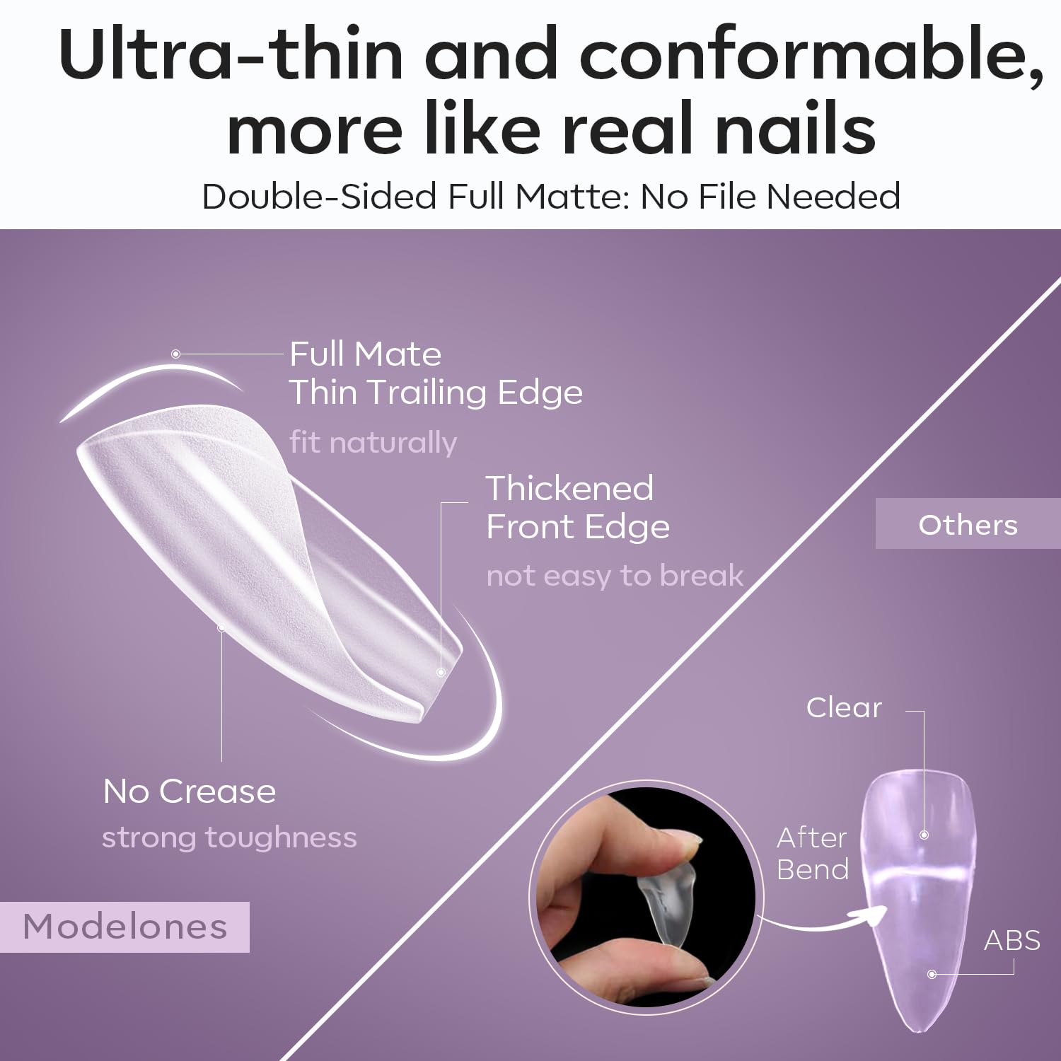 - Stronger Adhesion & Natural Nail Feeling: Modelones upgraded fully frosted texture for increased friction, which makes our soft nail gel tips feature stronger adhesion and a better fit on your nails. With high-quality soft nail gel material, strong toughness and malleability, thin and light with a thin back edge that fits perfectly on the cuticle of your fingers and a thick front edge that is very strong and resistant to breakage and no folding marks, more like natural nails