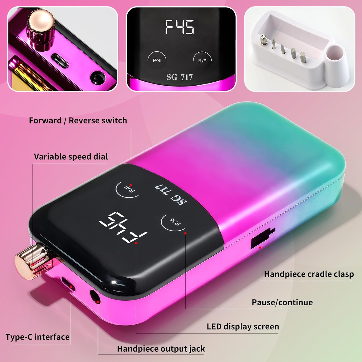 Professional Electric Nail Drill Machine,45000RPM Portable Rechargeable Efile Nail Drill Cordless,Electric Nail File Kit for Women (Gradient Green)